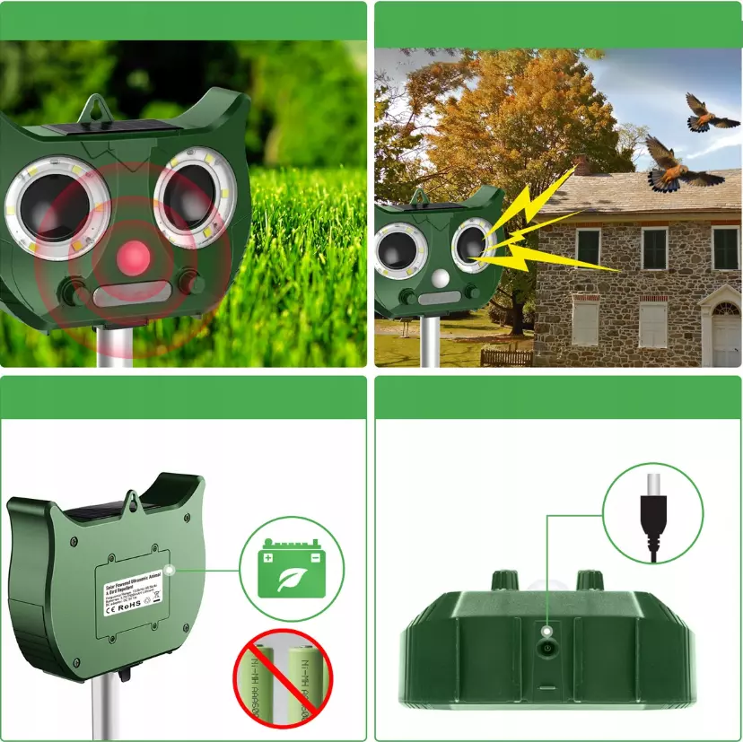 - Солнечная панель - позволяет заряжать аккумулятор отпугивателя