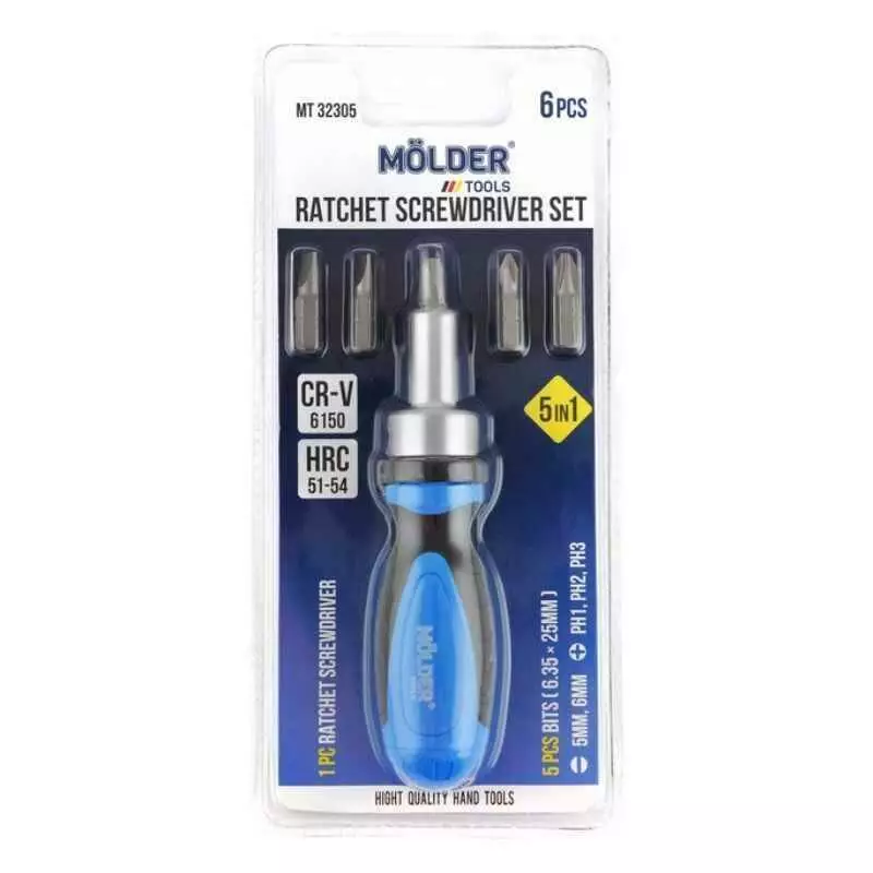 <p>Отвертка реверсивная с комплектом насадок Molder, 5 в 1</p>