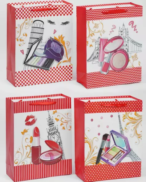 Подарунковий пакет – С 49705 Кількість видів – 4; Тема: косметика; Тип ручки: стрічка; Прикрашений - блискітками, 3D малюнок..