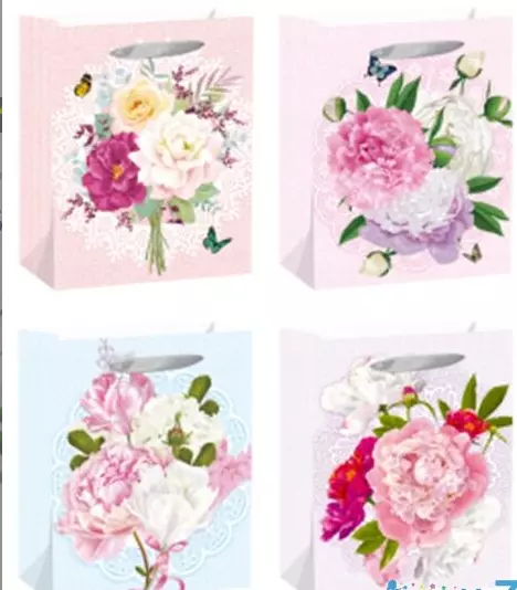 Подарунковий пакет – З 49736 Розмір: 31 х 12 х 40 см. Кількість видів – 4; Тема: квіти; Тип ручки: стрічка; Прикрашений - блискітками, 3D малюнок.