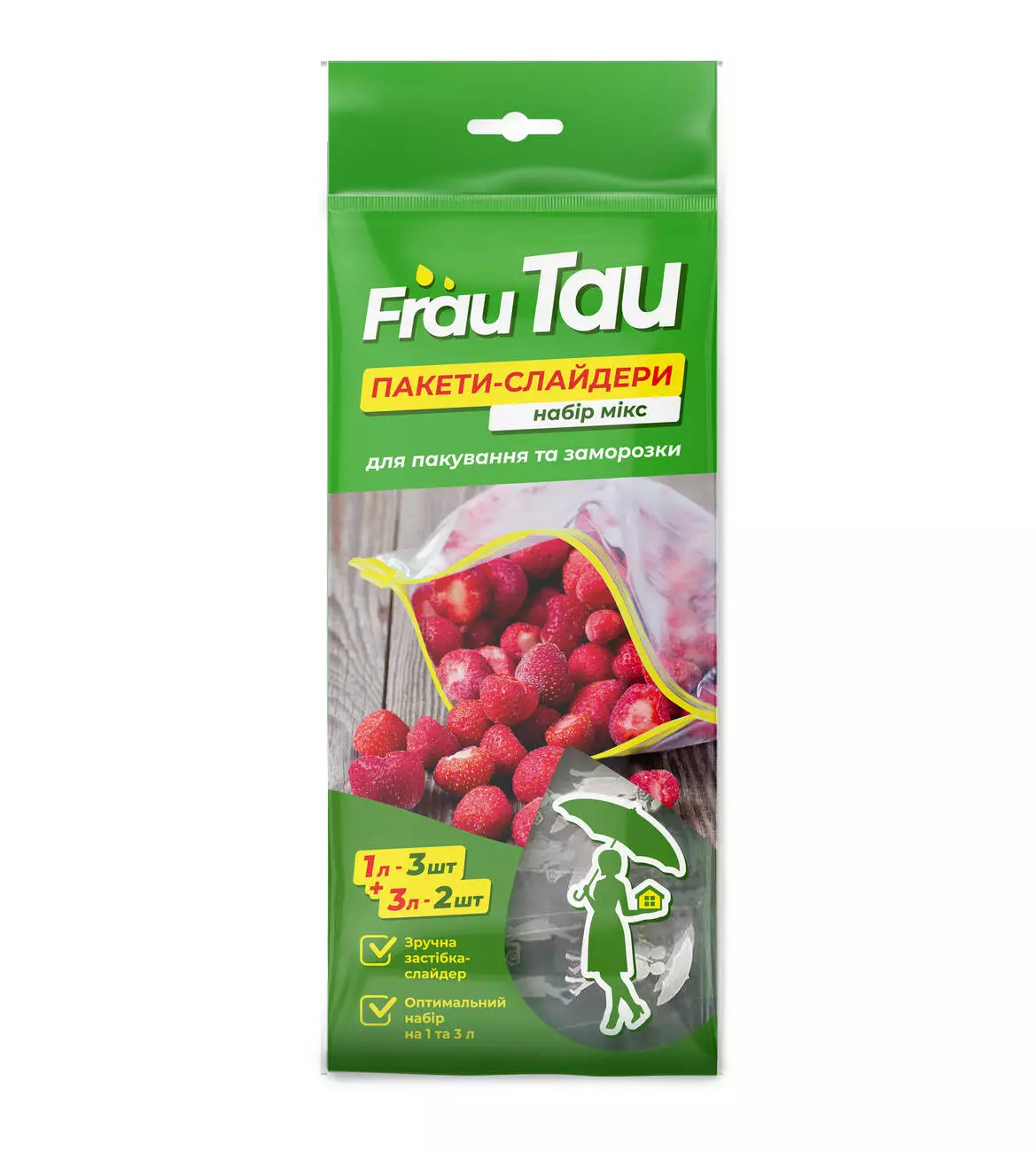 Универсальные пакеты-слайдеры торговой марки Frau Tau предназначены для хранения, замораживания и упаковки пищевых и непищевых продуктов. Замок-слайдер надежно и герметично закрывает пакет и предотвращает вытекание жидкостей, а также упрощает процесс открывания.