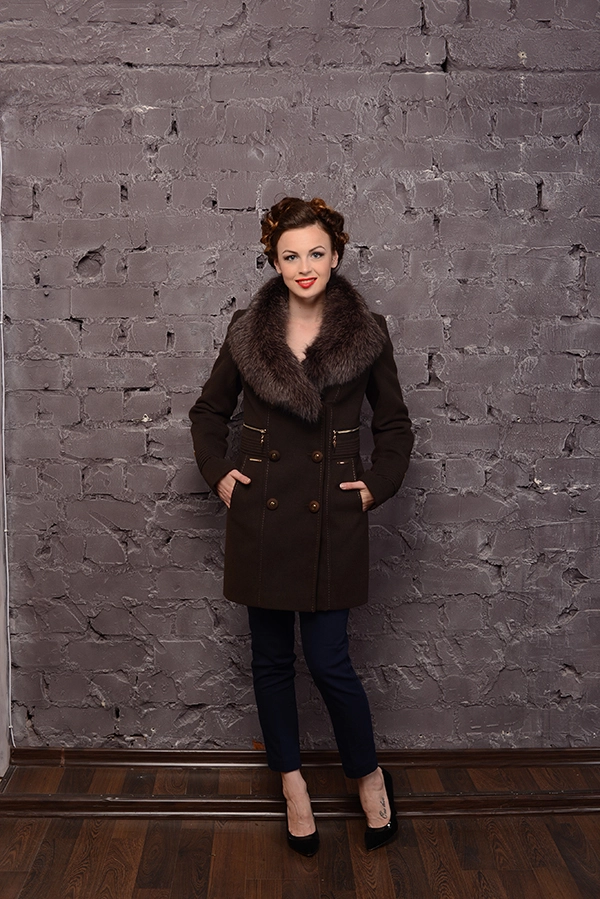 Зимнее полупальто. Материал изделия - кашемир, утеплитель - ватин. Воротник отложной, с оторочкой из натурального меха песца (съемная). Утеплитель - синтеватин. По бокам выше талии декоративные змейки, застежка - пуговицы. 2 прорезных кармана. Длина изделия 85 см. Размерный ряд модели 42-54.