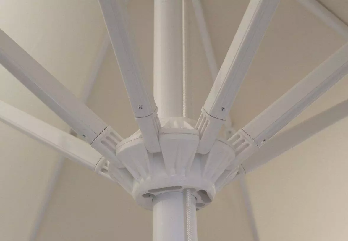 Професійна парасоля захистить від яскравих сонячних променів і створить приємну затінену атмосферу в приватних садах, зони біля басейну, відкритих літніх майданчиках кафе, барів і ресторанів. Виконання купола можливо з трьох тканин: бежевий поліестер, олефін і акрил. Варіанти забарвлення представлені в кольоровій палітрі для тканини олефін і акрил. Покриття опори і спиць можна вибрати з представленої палітри, в чорному кольорі + 10% до вартості виробу. Ціна на сайті вказана за тканину бежевий поліестер, вартість купола з тканини акрил і олефін уточнюйте у менеджера.