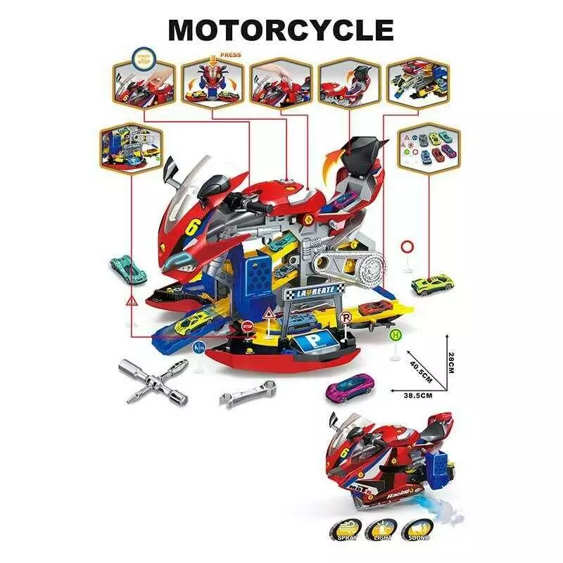 Парковка A 003-2 (8/2) довжина 40 см, світло, звук, пара, механічний запускач, розкладається, розбирається, 6 металопластик. машин, в коробці
