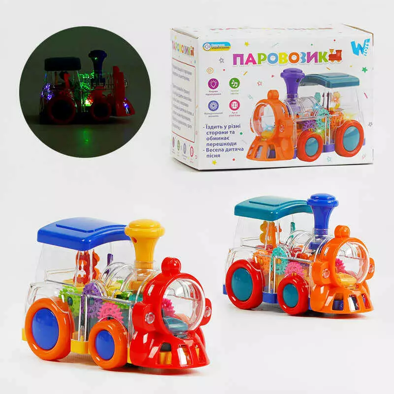 Паровозик ТК 52136 (48) "WToys", 2 кольори, ОЗВУЧУВАННЯ УКРАЇНСЬКОЮ МОВОЮ, звук, підсвічування, шестерні, колесо вільного ходу, в коробці