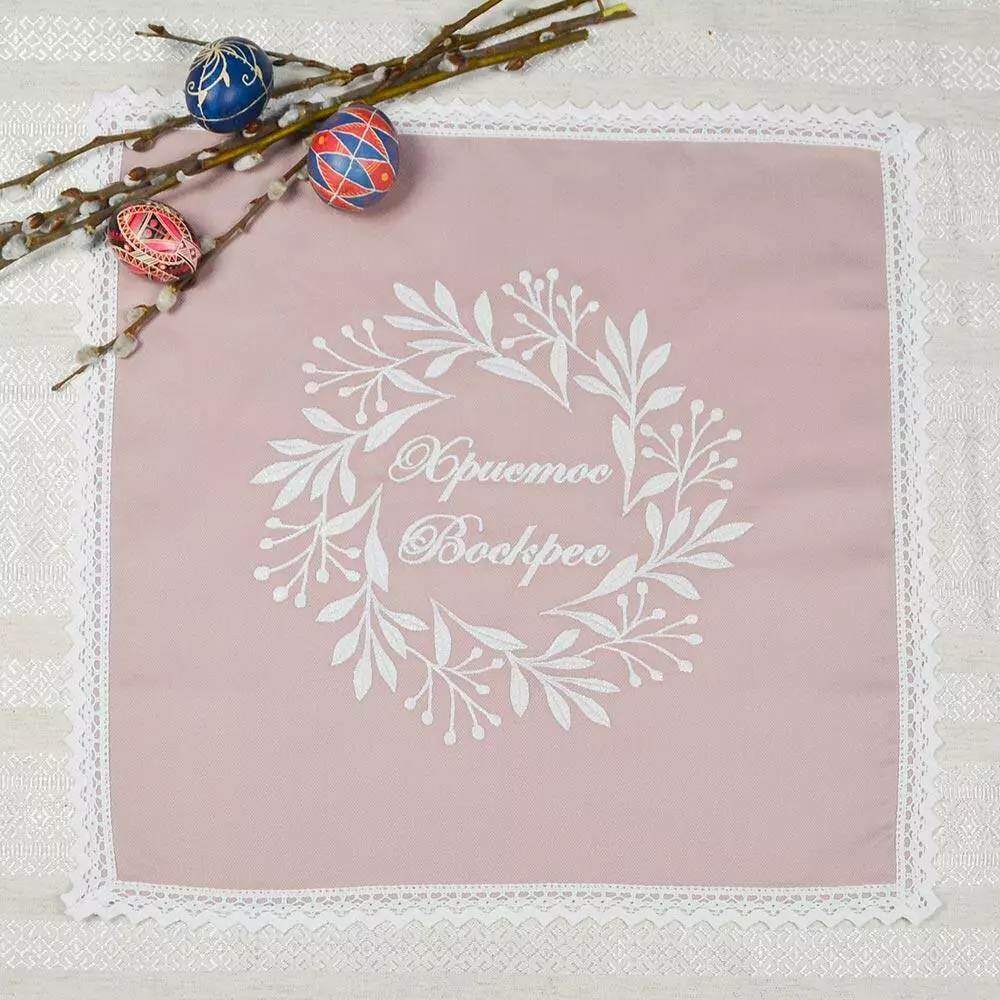 Столешня великодня прикрасить ваш святковий стіл. В основі щільне полотно, обшите якісним мереживом. Посередині машинна вишивка гладдю.