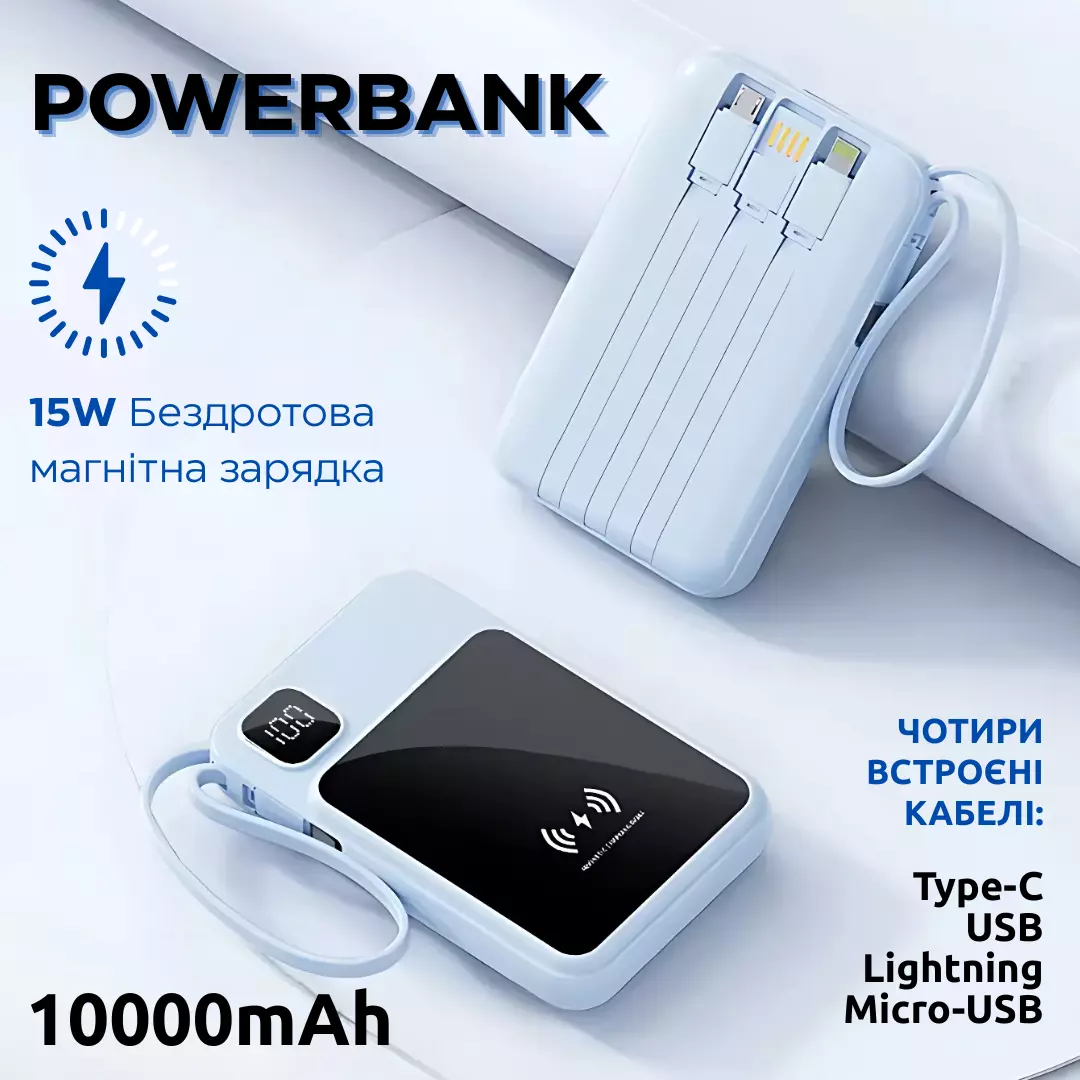 заряду у відсотках. Вбудовані кабелі Type-C, Lightning, Micro USB і
