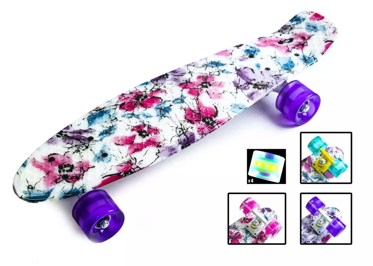 <p>Модный Penny Board "Flowers chamomile" с фиолетовыми колесами - лучший выбор для стильной и современной молодежи.</p><br /> <p>Описание и преимущества Penny Board :</p><br /> <ul><br /> <li>изделие торговой марки "Penny Board";</li><br /> <li>усиленный пластик в основе доски - легкость и комфорт;</li><br /> <li>компактный размер доски: 55 х 15 см, толщина 10 мм;</li><br /> <li>антискользящая обработка поверхности (рисунок на фасаде);</li><br /> <li>прочная алюминиевая подвеска;</li><br /> <li>качественные подшипники ABEC-7;</li><br /> <li>бесшумные PU-колеса (полиуретан);</li><br /> <li>уровень жесткости колес – 90 А;</li><br /> <li>предел нагрузки - 75 кг;</li><br /> <li>дизайн и цветовое оформление: доска белого цвета с изображением цветов (фиолетовые светящиеся колеса).</li><br /> </ul><br /> <p>Купить Penny Board "Flowers chamomile" и обеспечить себя увлекательным катанием при небольших затратах</p><br /> <p>Яркий, стильный и недорогой Penny Board "Flowers chamomile" - лучший выбор для современных детей и подростков. Эти легкие, удобные и маневренный скейты пользуются широкой популярностью среди детей и взрослых во всем мире. Теперь у Вас есть реальная возможность идти в ногу со временем и стать обладателем этого чудного спортивного снаряда по выгодной цене. Покупать скейтброды в нашем интернет-магазине очень удобно: Вам нужно лишь определиться с моделью и выбрать необходимые параметры, оформить заказ и спокойно ждать пару дней, пока товар доставят в Ваш населенный пункт. Мы осуществляем отправку в любую точку на карте Украины, и уже через 1-2 дня заказ будет ждать Вас на складе курьерской службы.</p><br />