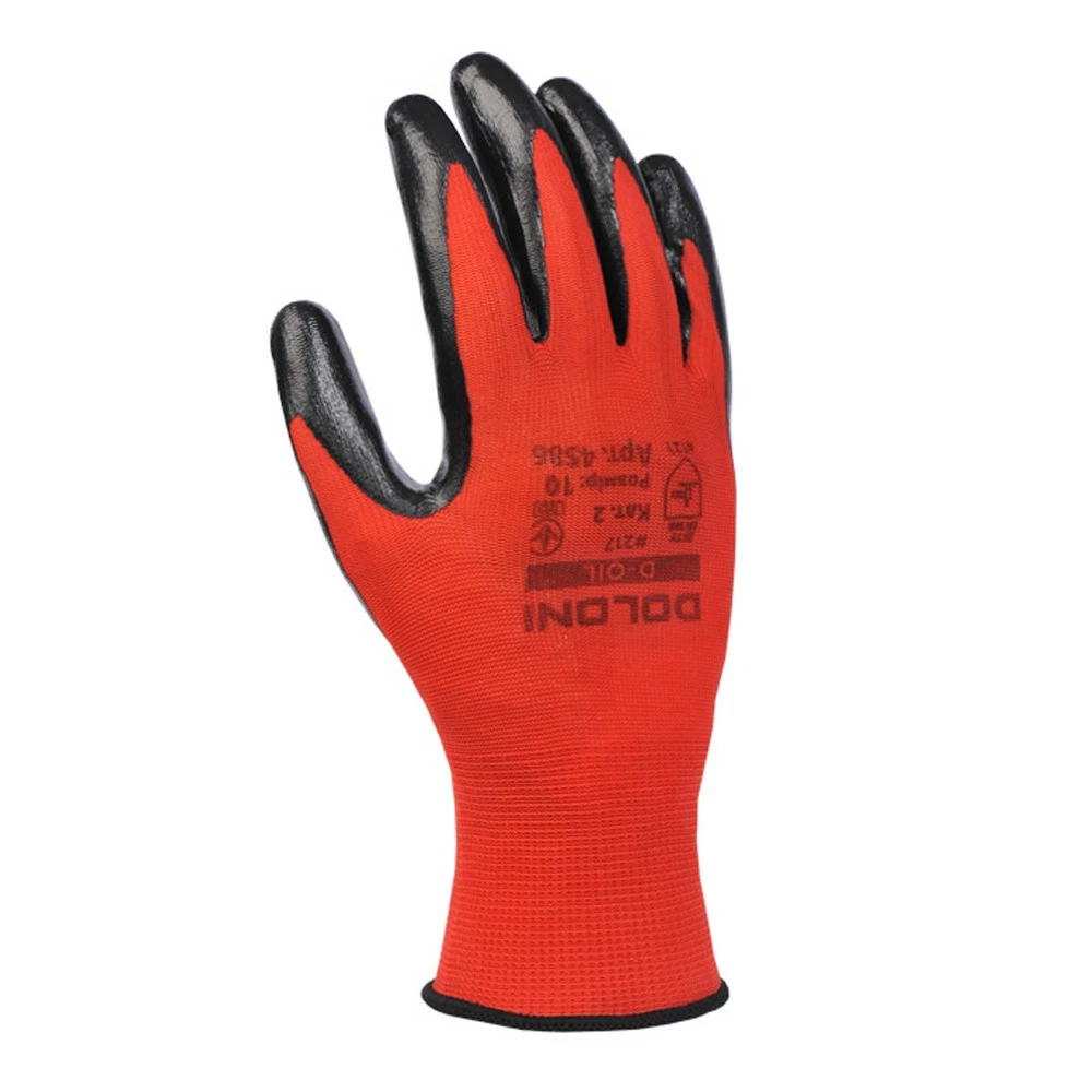 Рабочие перчатки трикотажные с нитриловым обливом производства DOLONI 4586 изготавливаются в 10 размере (L). Данная модель рабочих перчаток маслобензостойкие и имеют обширную область применения. Они выполнены из материла полиэстер с нанесением нитриловго покрытия на ладонной части и пальцах перчаток. Основа ткани полиэстер очень крепкая за счет чего перчатки служат достаточно долго, а нанесенное нитриловое покрытие, защищает от воздействия агрессивной внешне среды.