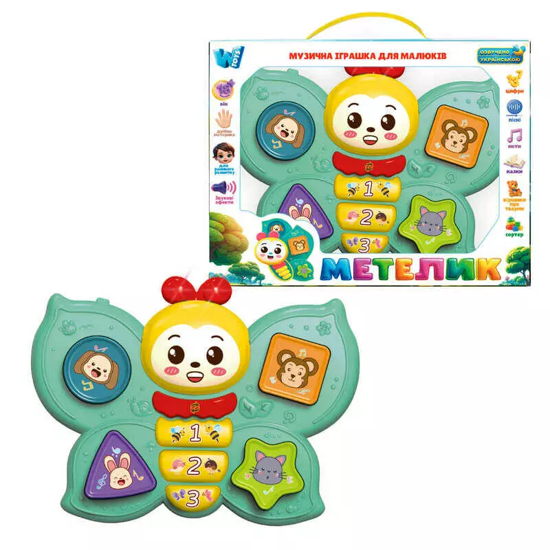 Музичний метелик 47411 (24) "WToys", ОЗВУЧЕННЯ УКРАЇНСЬКОЮ, пісні, мелодії, загадки, звуки тварин, підсвічування, сортер, в коробці