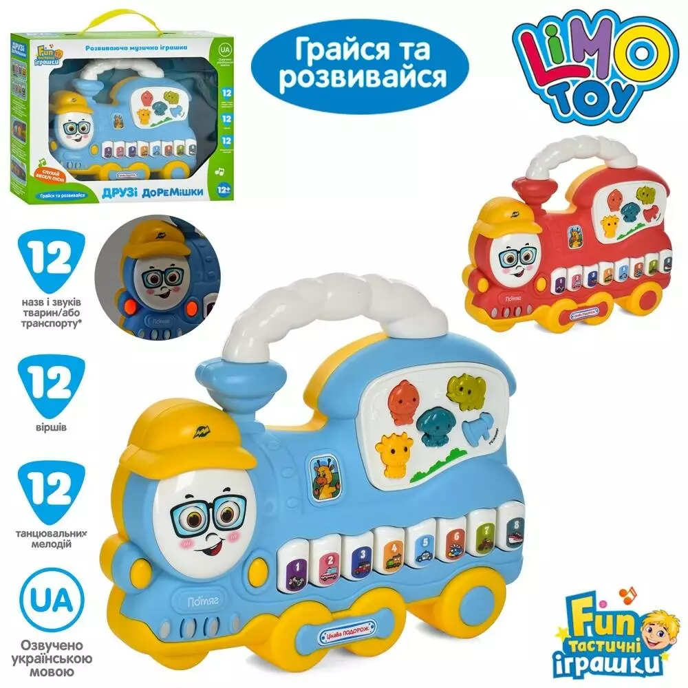 Піаніно FT 0038 AB паровоз, 2 кольори, муз. (укр.), світло, бат., кор., 27,5-21-5 см.