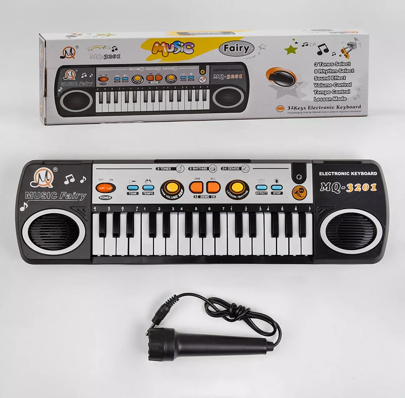 Юный композитор виртуоз не сможет обойтись без музыкального пианино MQ 3201! Синтезатор познакомит Вашего ребенка с потрясающим миром звуков и мелодий, поможет культурно обогатиться и сформирует музыкальный вкус. В конструкцию модели включили 31 активная клавиша с огромной панелью качественных настроек. Во время своих репетиций малыш сможет настраивать тон мелодий, пользоваться микрофоном и корректировать громкость. Особенности: - 3 тона; - 8 ритмов; - звуковой эффект; - регулировка громкости; - регулирование темпа; - 24 демо мелодии; - микрофон. Комплектация: - пианино; - микрофон. Пианино работает от 4-ти батареек типа “АА” - в комплект не входят.