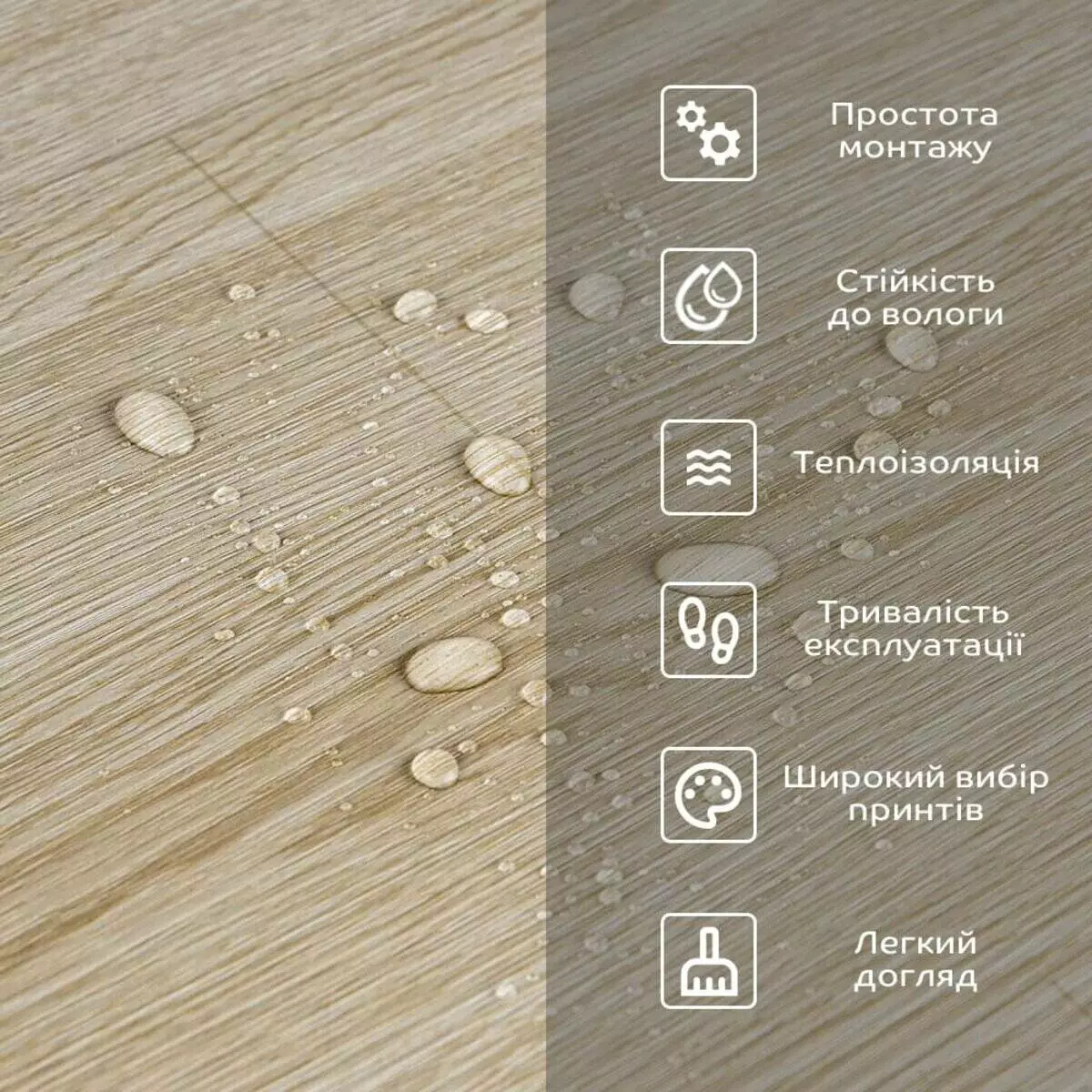 5. Естетична складова: широкий вибір принтів, що імітують натуральні матеріали, дозволяє підібрати покриття, яке відповідає вашому стилю та інтер'єру, дуже добре комбінується за гамою кольорів, дозволяючи створити власний дизайн приміщення;
