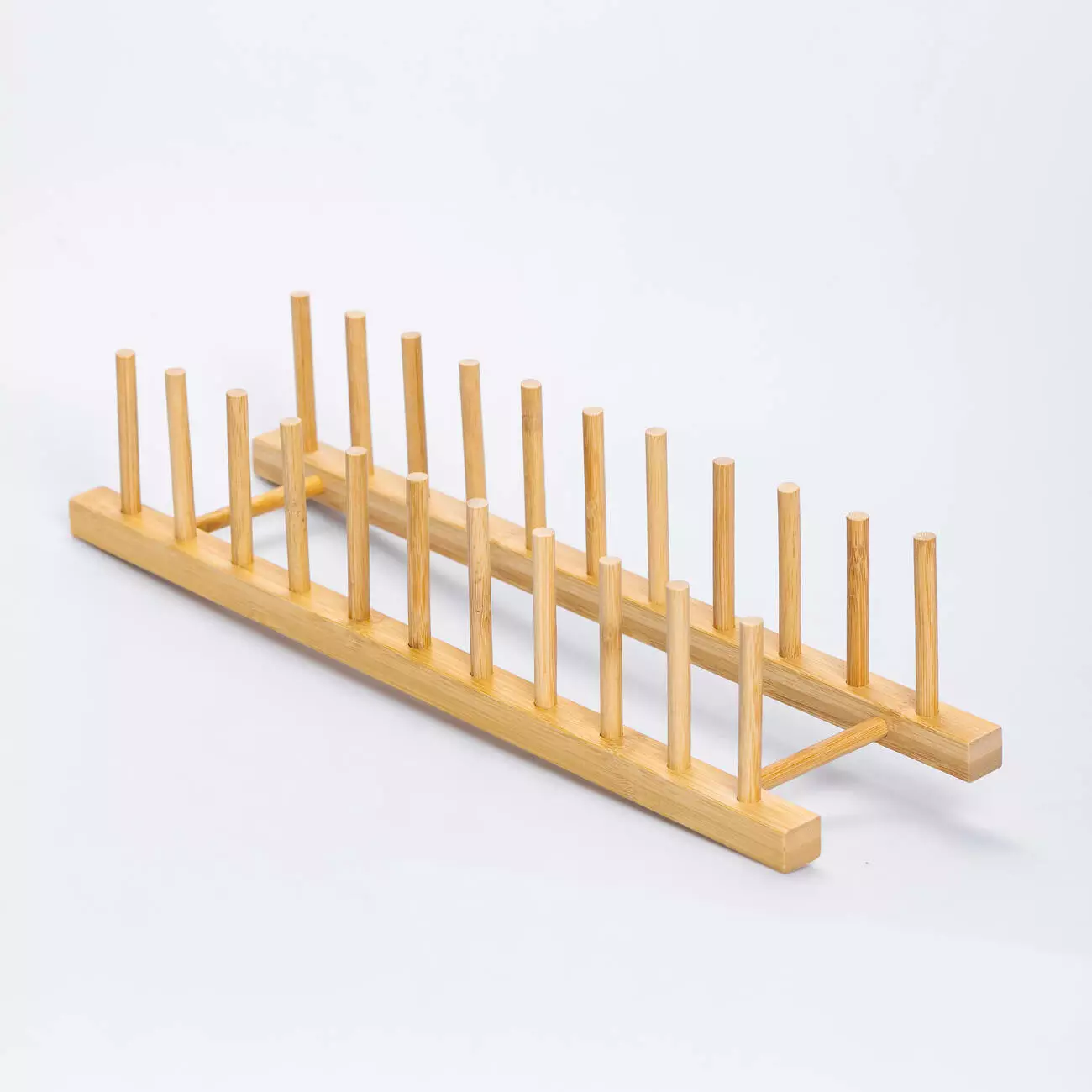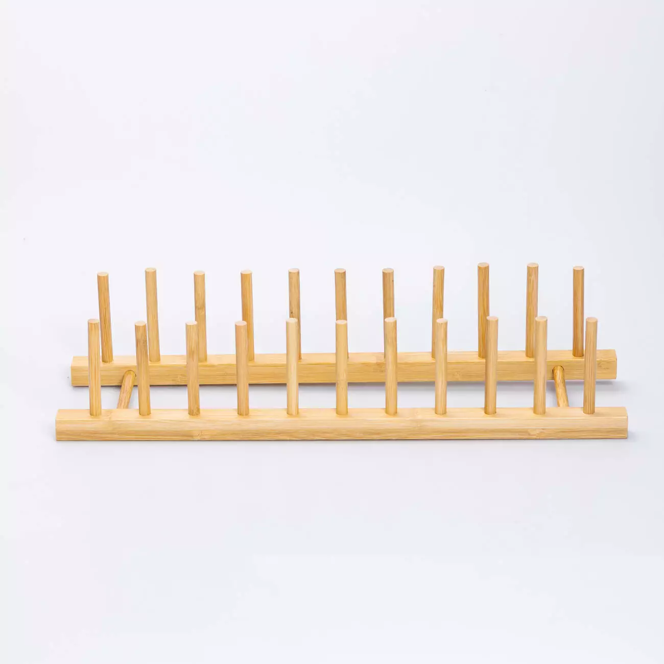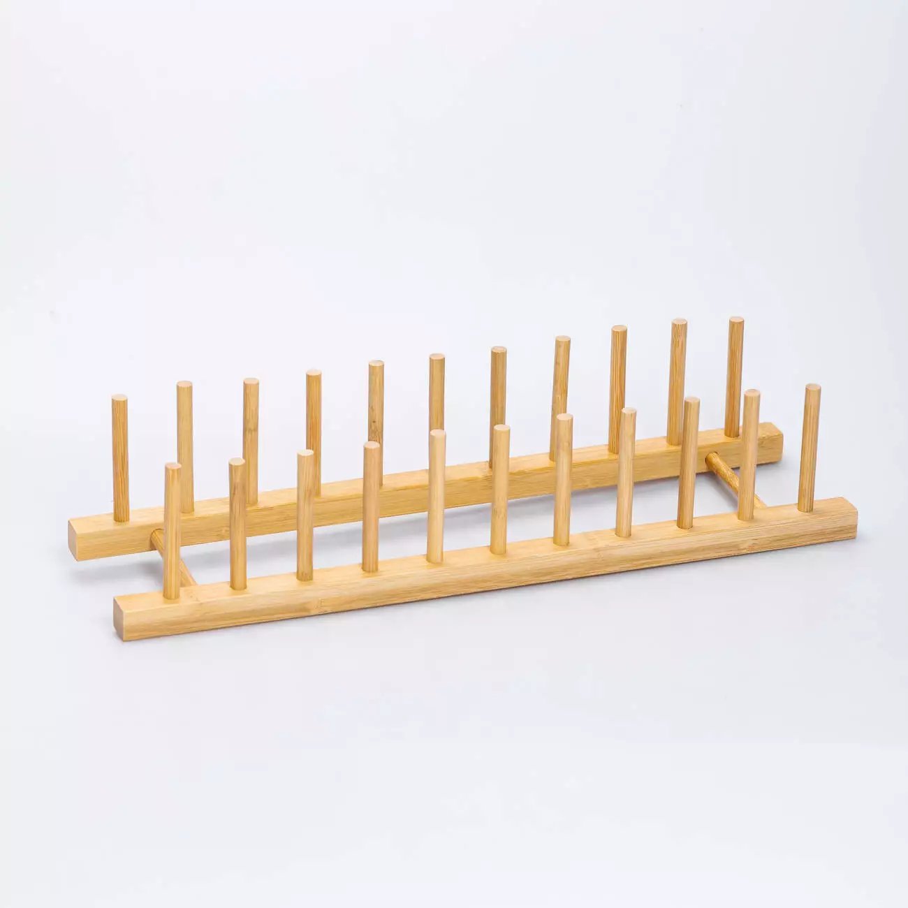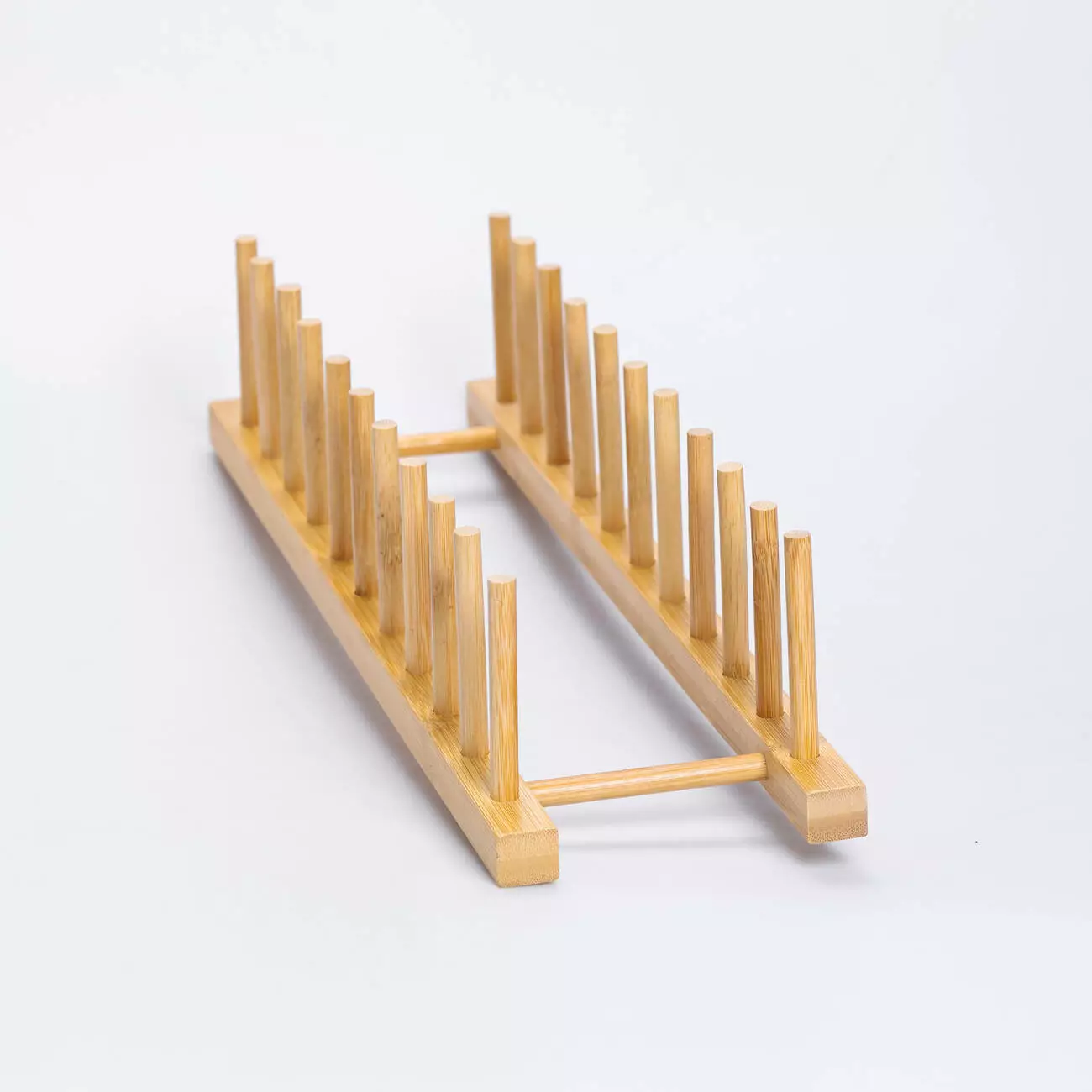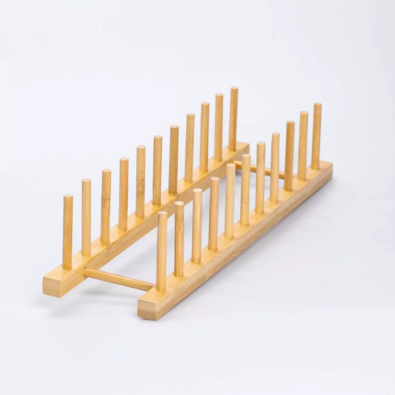 Підставка для тарілок з бамбука допоможе організувати простір на кухні, зберігаючи посуд у вертикальному положенні. Завдяки компактним розмірам вона не займає багато місця та підходить для розміщення на робочій поверхні чи в сушильній шафі. Конструкція складається з двох паралельних планок та рядів вертикальних стрижнів, між якими зручно ставити тарілки.