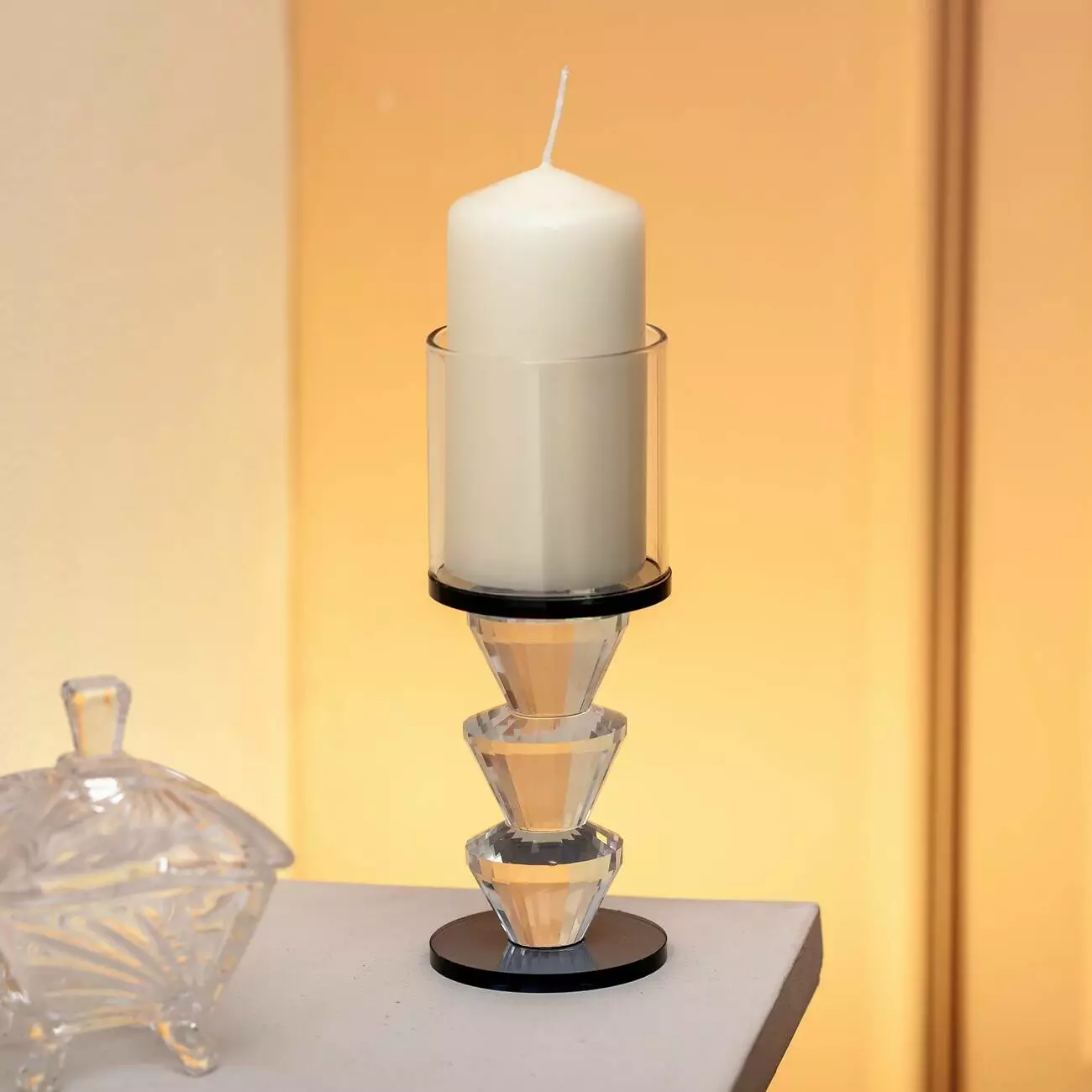 Підсвічник декоративний Parallels виготовлений зі скла та має сучасний геометричний дизайн. Завдяки прозорим стінкам і темним акцентам конструкція виглядає лаконічно та стримано. Пряма форма верхньої частини і кругла основа, доповнена конічним елементом, створюють візуальний баланс і додають стабільності виробу.