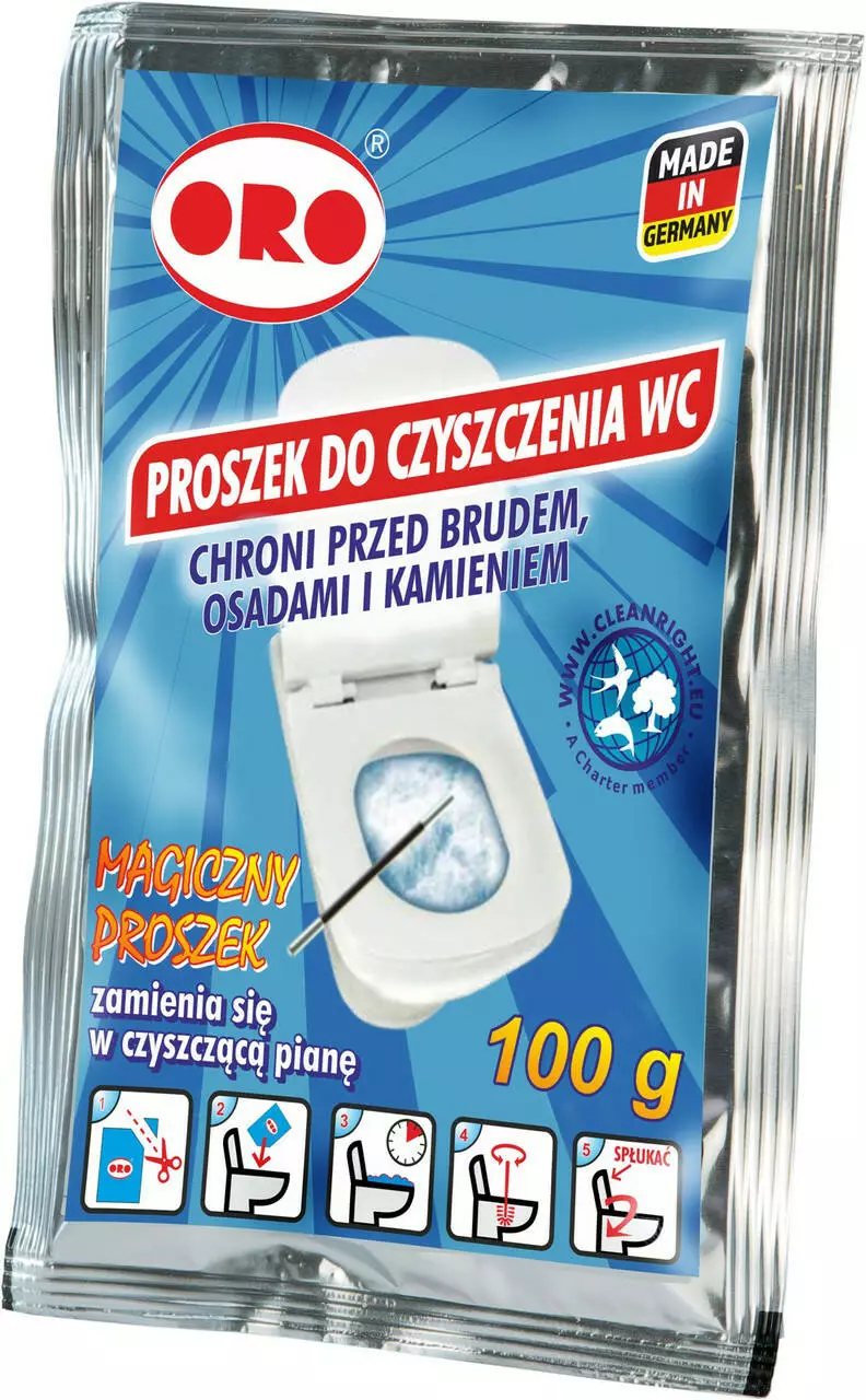 Розріжте пакетик і обережно вилийте весь вміст у миску на поверхню води. Після заливки утворюється активна миюча піна. Залиште приблизно на 15 хвилин, поки не зникне піна. Очистіть чашу щіткою і змийте воду в унітазі.