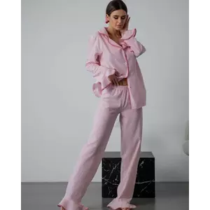 Невагома жіноча піжама з натуральної бавовняної тканини, в якій Вам буде зручно, легко та комфотрно. Комплект: сорочка на гудзиках із кишенею на грудях + штани прямого вільного крою на резинці + пов'язка для волосся. Костюм прикрашений воланами на рукавах та штанях, края виробу оздоблені кольоровим кантом.