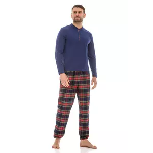 Піжама чоловіча, що поєднує комфорт і практичність, складається з лонгсліва із куліру та штанів із м’якої фланелі. Верх виконаний із легкого, приємного до тіла бавовняного трикотажу, що забезпечує вільну циркуляцію повітря та комфорт навіть під час тривалого носіння. Штани зі щільної фланелі дарують тепло й затишок у прохолодні вечори, не обмежуючи рухів. Ідеальний варіант для домашнього відпочинку та повноцінного сну в будь-яку пору року
