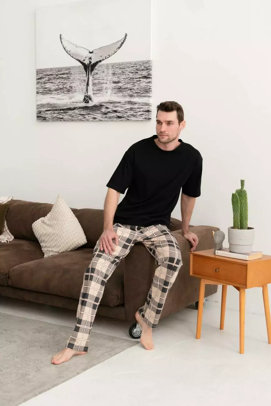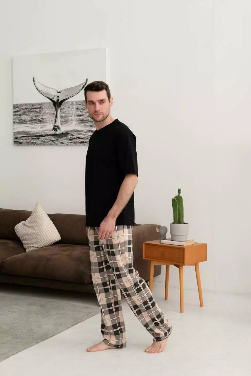 Футболка чорна, штани в клітку беж./темно-сірий.