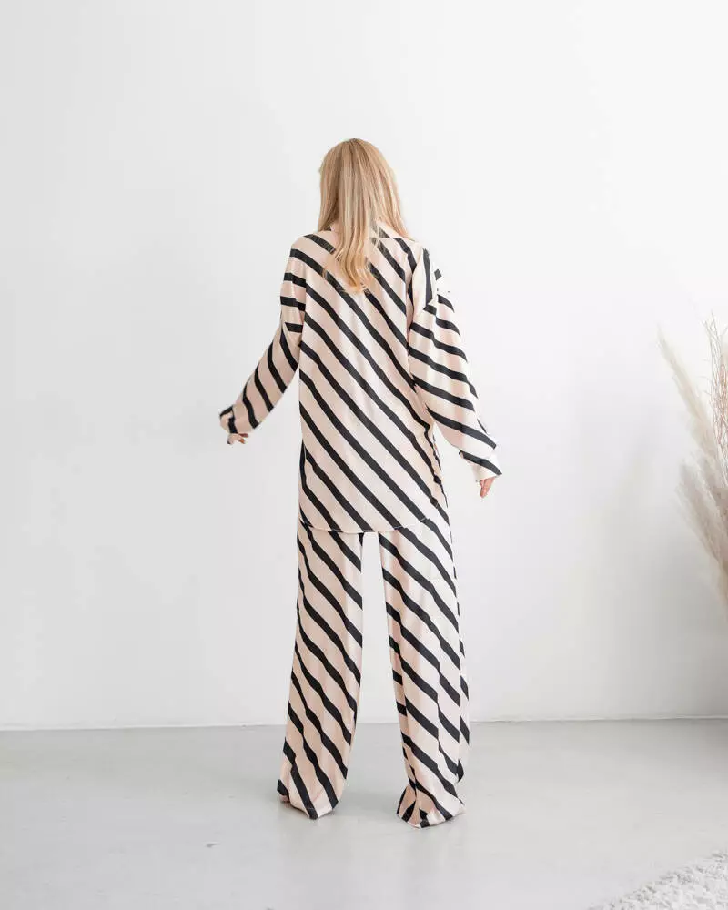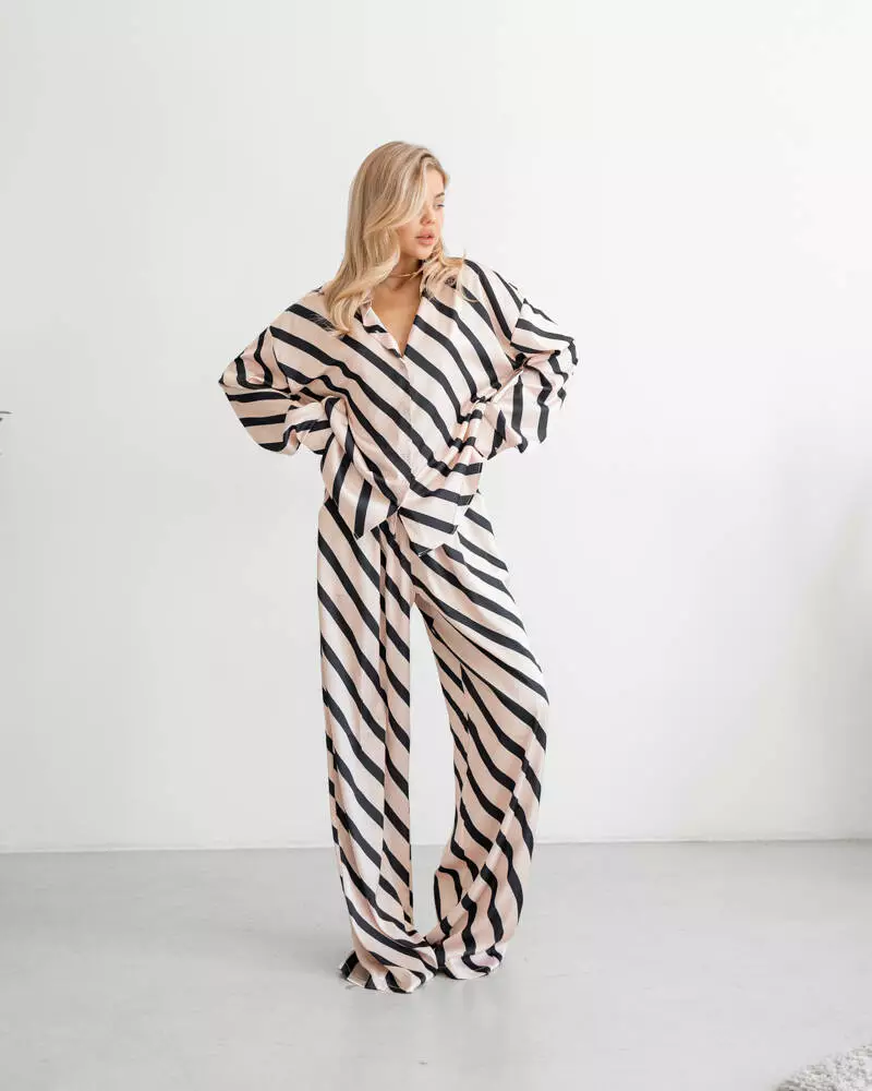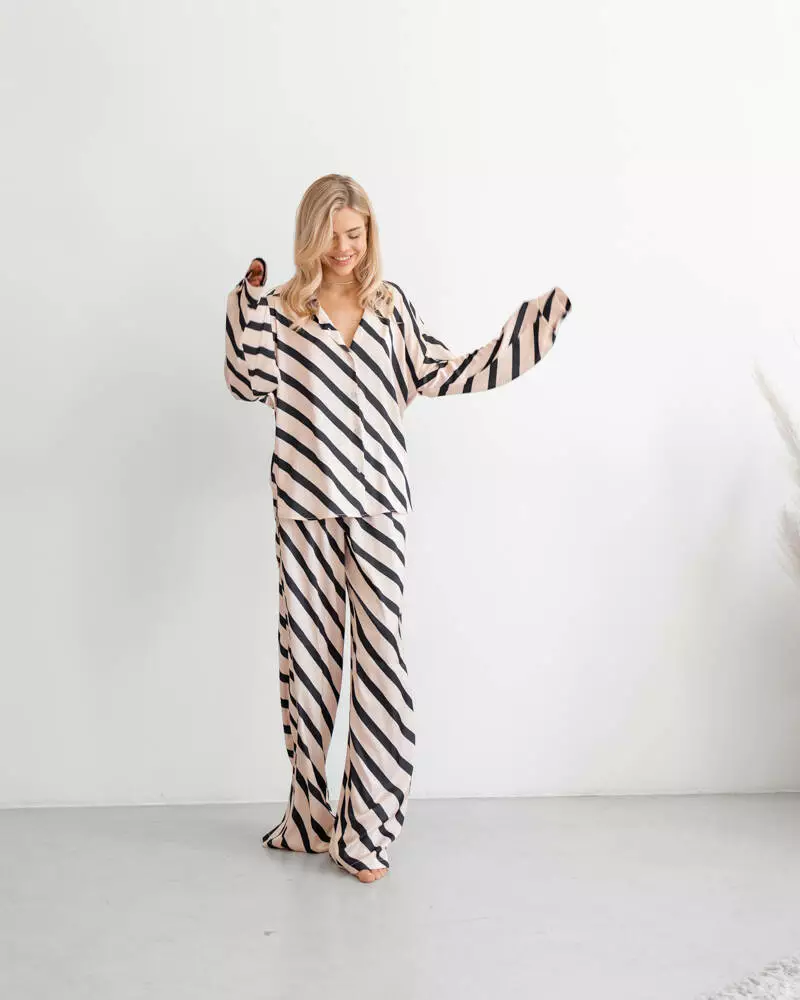 Жіноча піжама зі смугастим принтом з шовкової тканини Armani. Комплект складається з довгої сорочки на ґудзиках та штанів вільного крою на резинці. Жіночий костюм ідеально підходить для сну та домашніх справ. Тканина майже не мнеться, добре пропускає повітря та не втрачає колір при пранні.