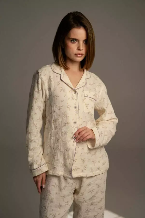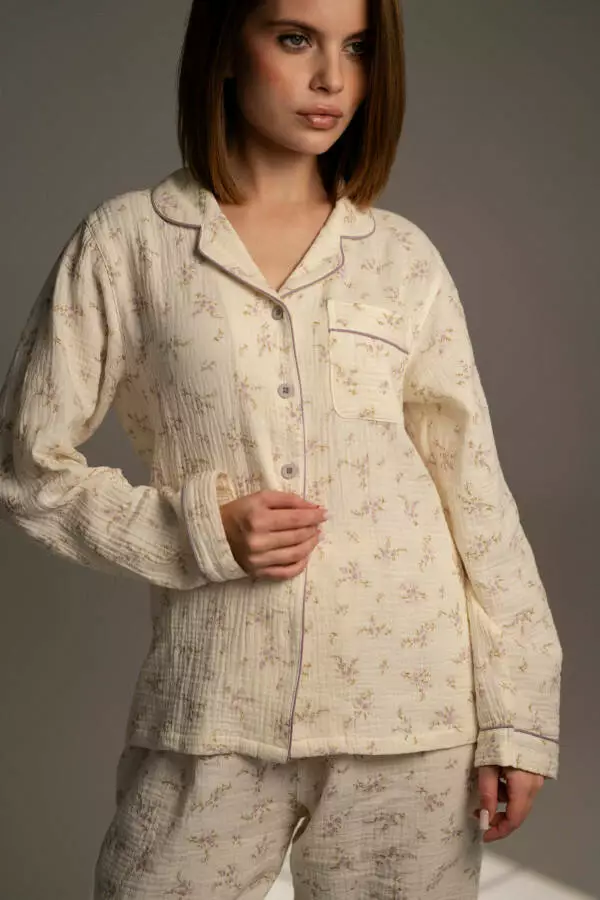Піжама із мусліну – легкість, комфорт і стиль в одному образі. Виготовлена зі 100% натурального мусліну – м’якої, дихаючої тканини, що чудово підходить для сну та домашнього відпочинку. Ніжна квітковий принт, вільний крій і приємна фактура створюють відчуття затишку та розслаблення. Особливості: м’який матеріал, вільний крій, ґудзики, нагрудна кишеня