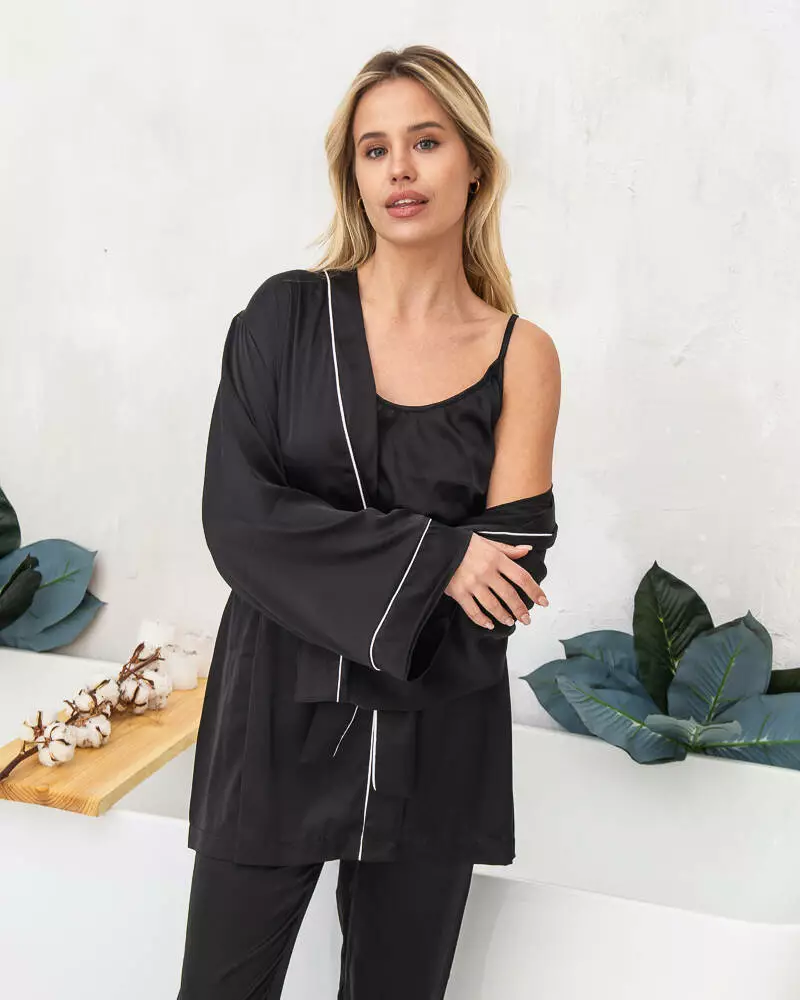 Піжамний костюм четвірка "Raya" (штани+майка+шорти+халат) з шовку Армані Чорний