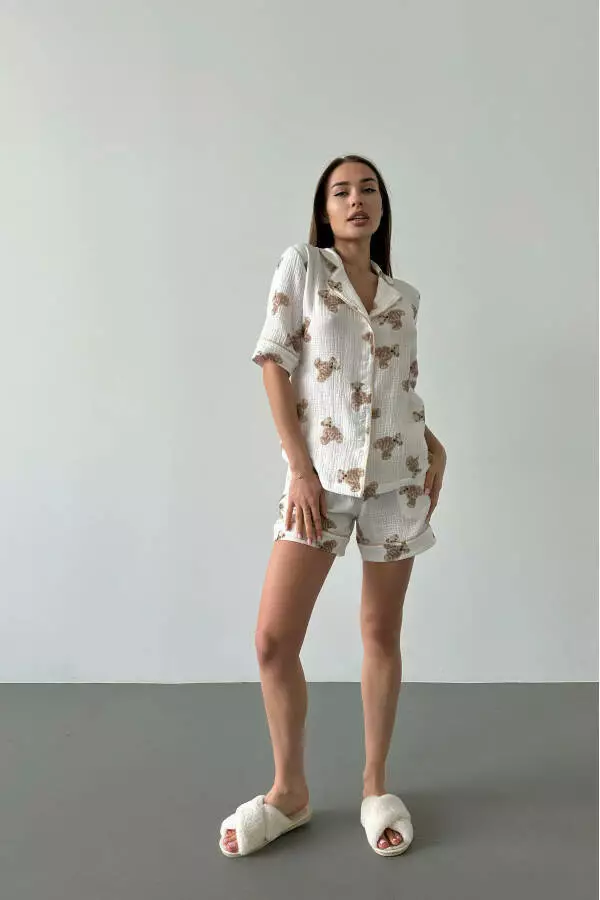 Піжамний комплект сорочка та шорти виготовлений з муслінової тканини, комплект білого кольору прикрашений чарівним принтом ведмедиків. Ця м'яка, легка тканина ідеально підходить для комфортного сну та забезпечить вам затишні ночі
