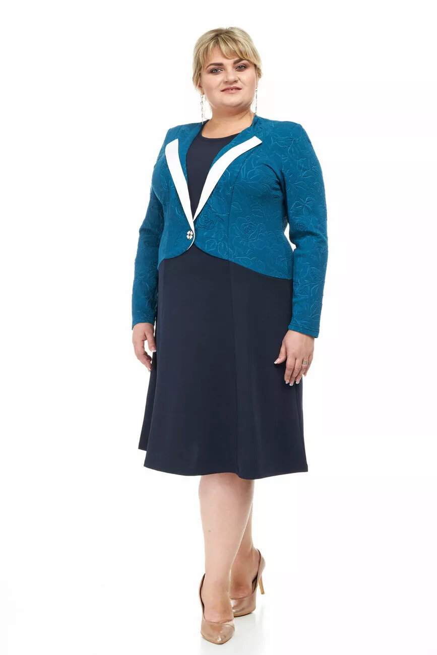 Тканина: французький трикотаж – 77% поліестер; 18% віскозу; 5% спандекс, жаккард -100% полієстер. Красива сукня Двійка з тканини жакард, кукурудза, французький трикотаж. Модель імітація двійки - сукня та болеро. Силует трапеції. Рукав довгий. Горловина кругла.Болеро на гарному ґудзику.