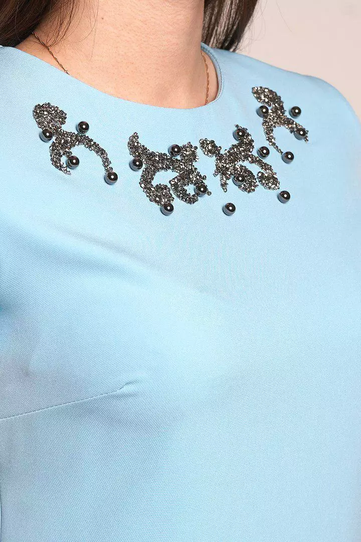 Женственное платье Мирела выполнено из ткани креп-костюмка высокого качества. Платье прямого покроя, длинной миди, с коротким рукавом. Украшением платью служат черные камни с жемчугом. Такое платье смело можно одеть на работу и на мероприятие, в нем Вы будите выглядеть женственно, стильно и красиво.
