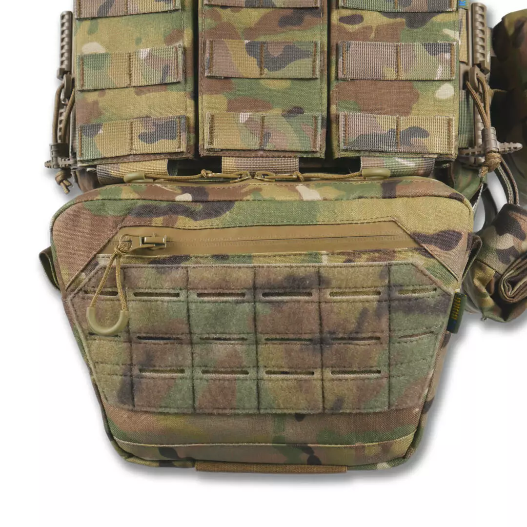 Плитоноска оснащена съемной передней Molle панелью, которая крепится к основанию на Velcro и дополнительно двумя карабинами Woojin. На ней удобно размещаются 3 итога под 1 или два магазина, или другое Molle-совместимое снаряжение. Эту панель можно быстро заменить другой с закрёклым на нее заранее набором нужных итогов.