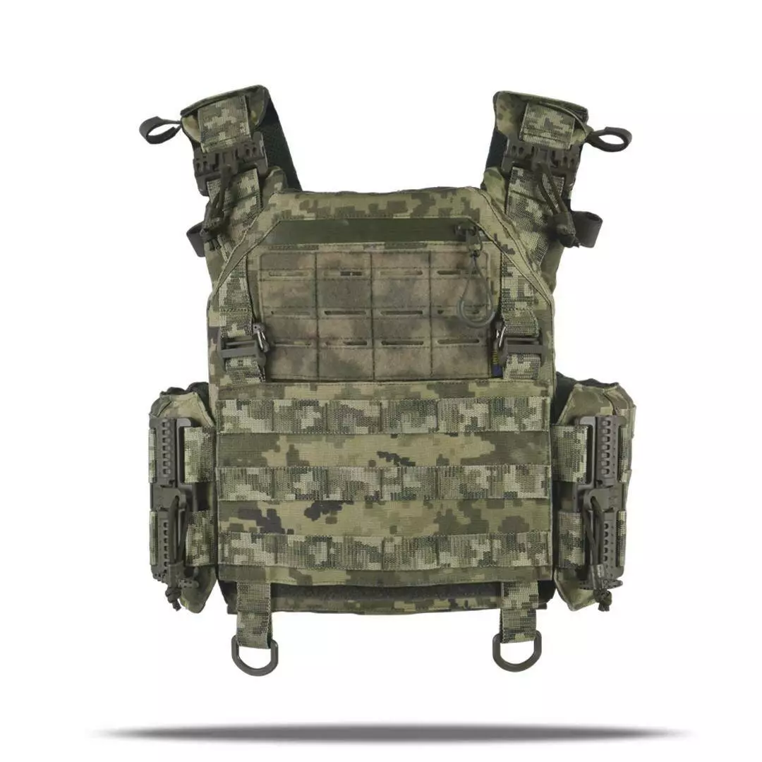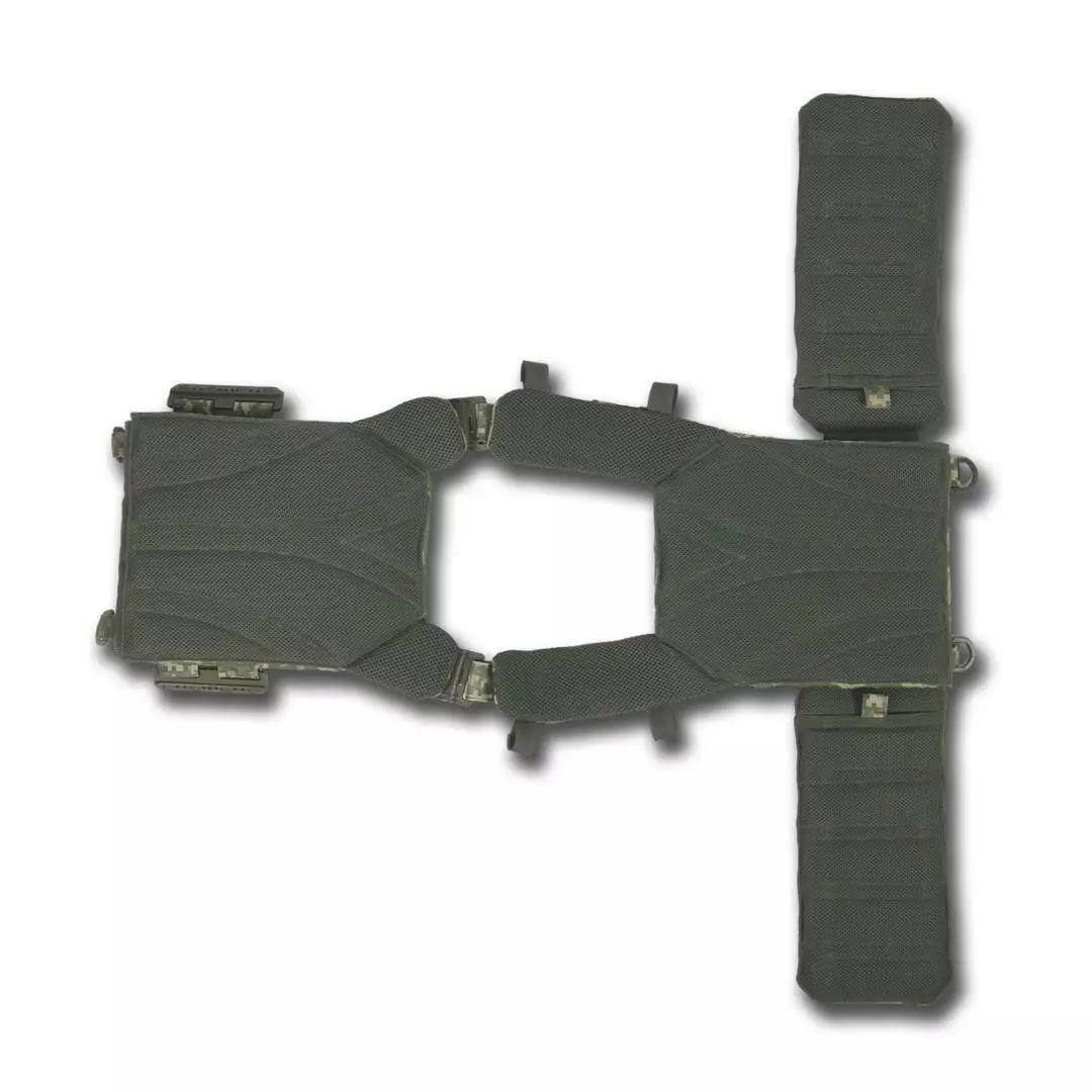 Плитоноска оснащена съемной передней Molle панелью, которая крепится к основанию на Velcro и дополнительно двумя карабинами Woojin. На ней удобно размещаются 3 итога под 1 или два магазина, или другое Molle-совместимое снаряжение. Эту панель можно быстро заменить другой с закрёклым на нее заранее набором нужных итогов.
