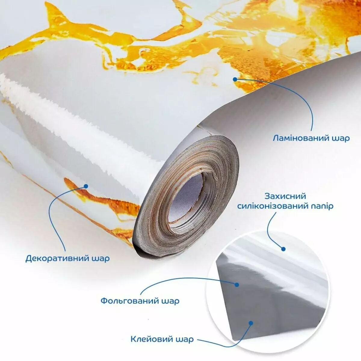• Вологостійкість: завдяки ламінації, плівка має підвищену стійкість до вологи, що робить її ідеальною для використання у приміщеннях з підвищеною вологістю, таких як кухня чи ванна кімната.