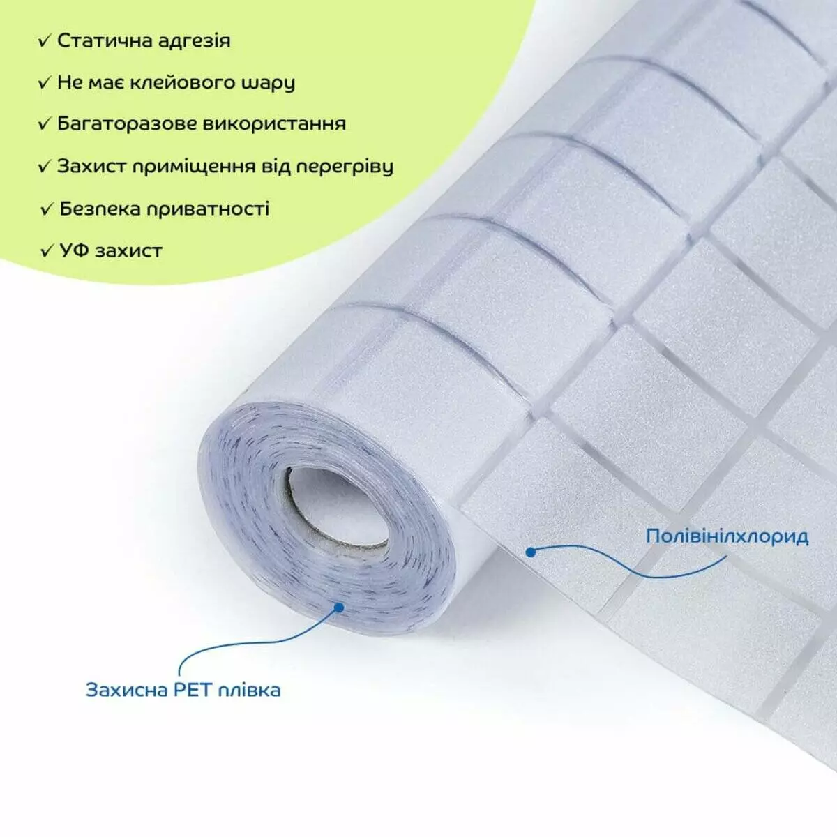 • Універсальність та легкість в монтажі: ПВХ плівки можна легко різати ножицями або монтажним ножем, що дозволяє використовувати їх у різних місцях: на вікнах, розсувних дверях, кухонних шафах та інших скляних поверхнях.