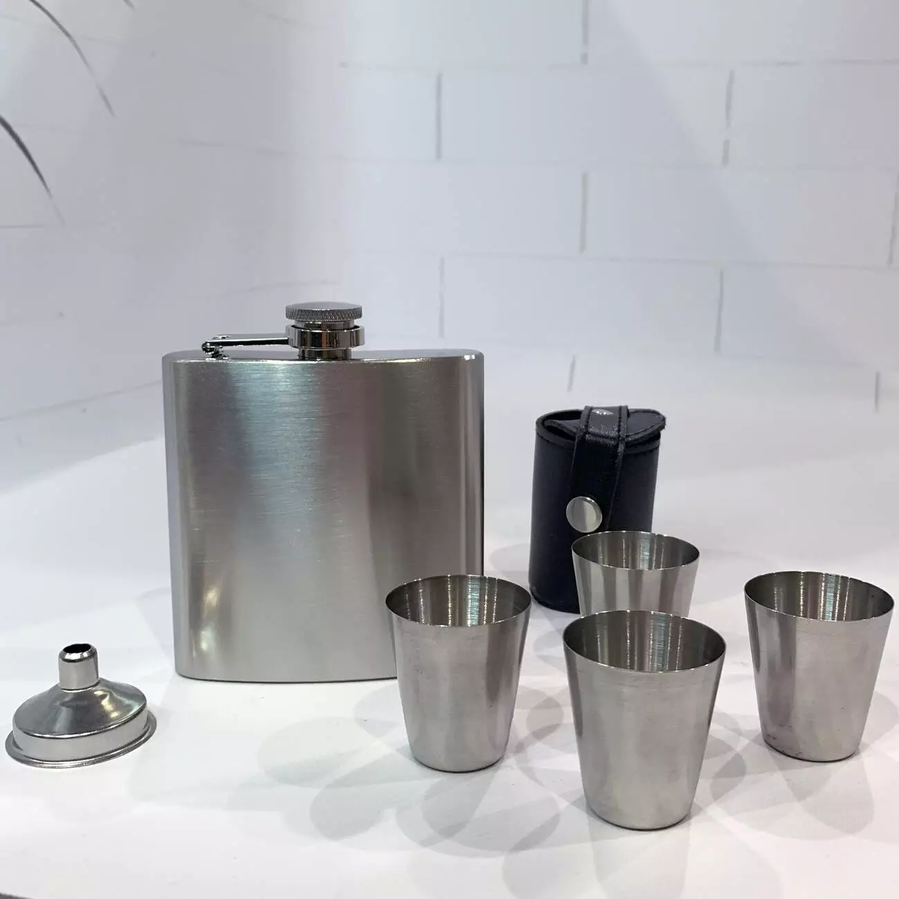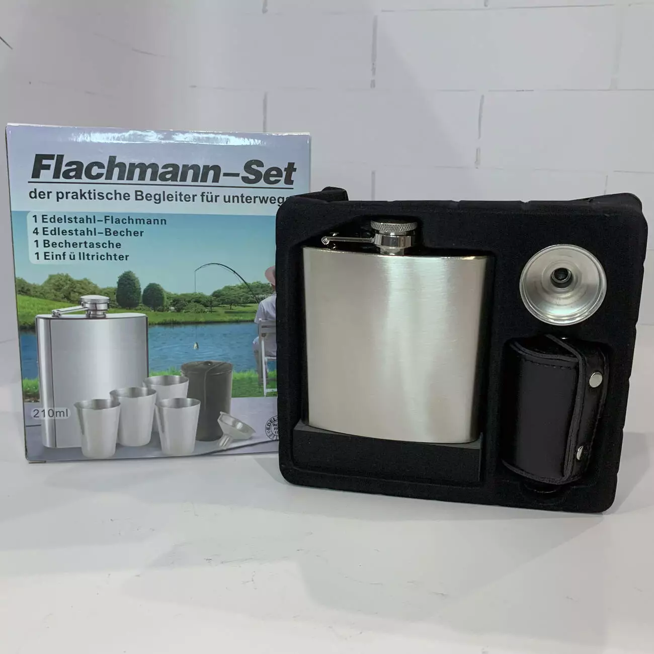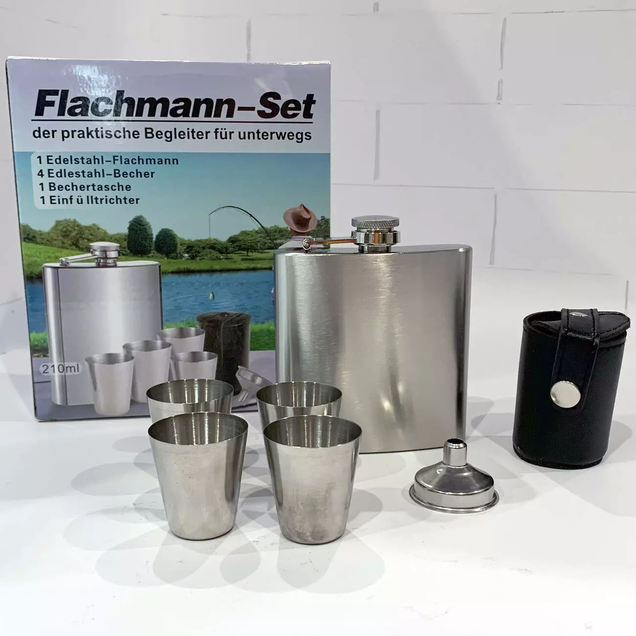 Функциональный и компактный набор, включающий фляжку объёмом 210 мл, четыре металлические рюмки по 30 мл, воронку и чехол для хранения. Все элементы изготовлены из нержавеющей стали и упакованы в подарочную коробку — отличный подарок для мужчины на любой повод.