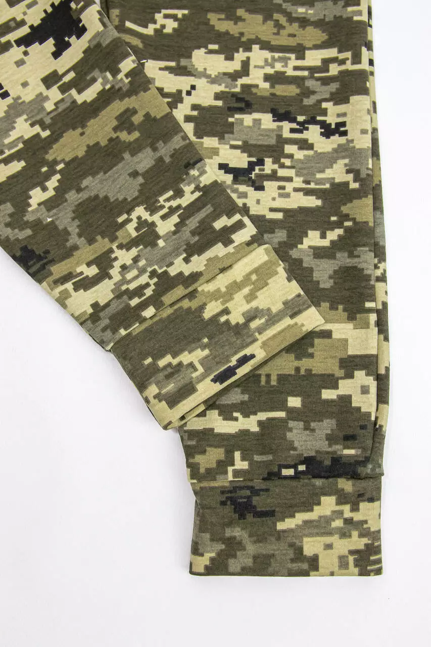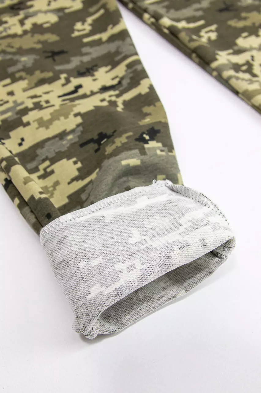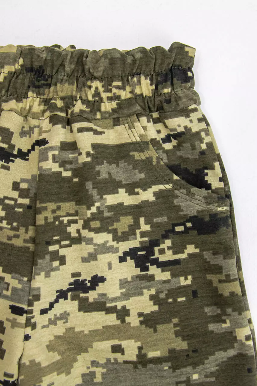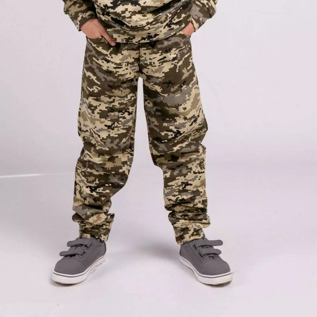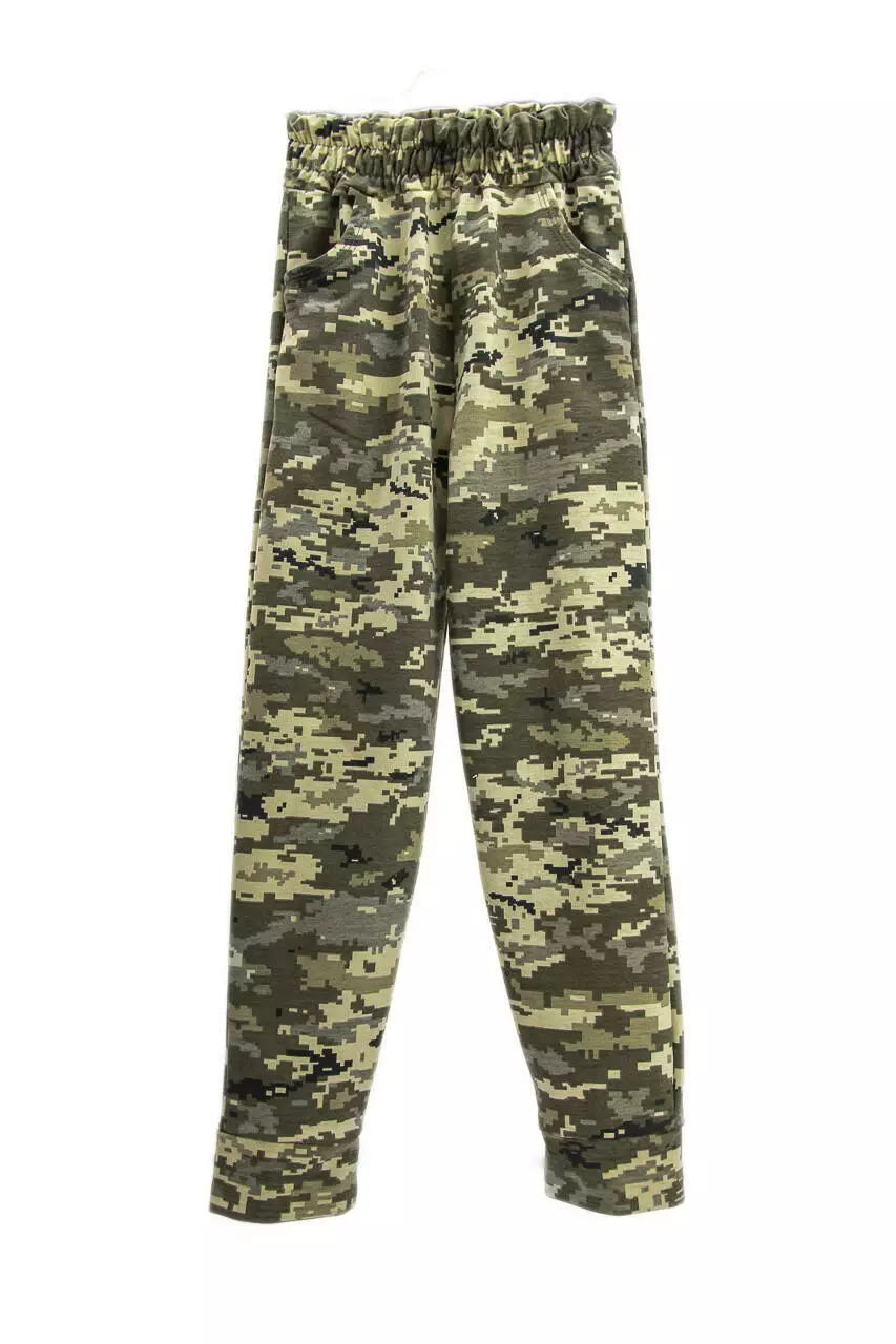 Брюки имеют карманы, а по низу украшены трикотажным манжетом.