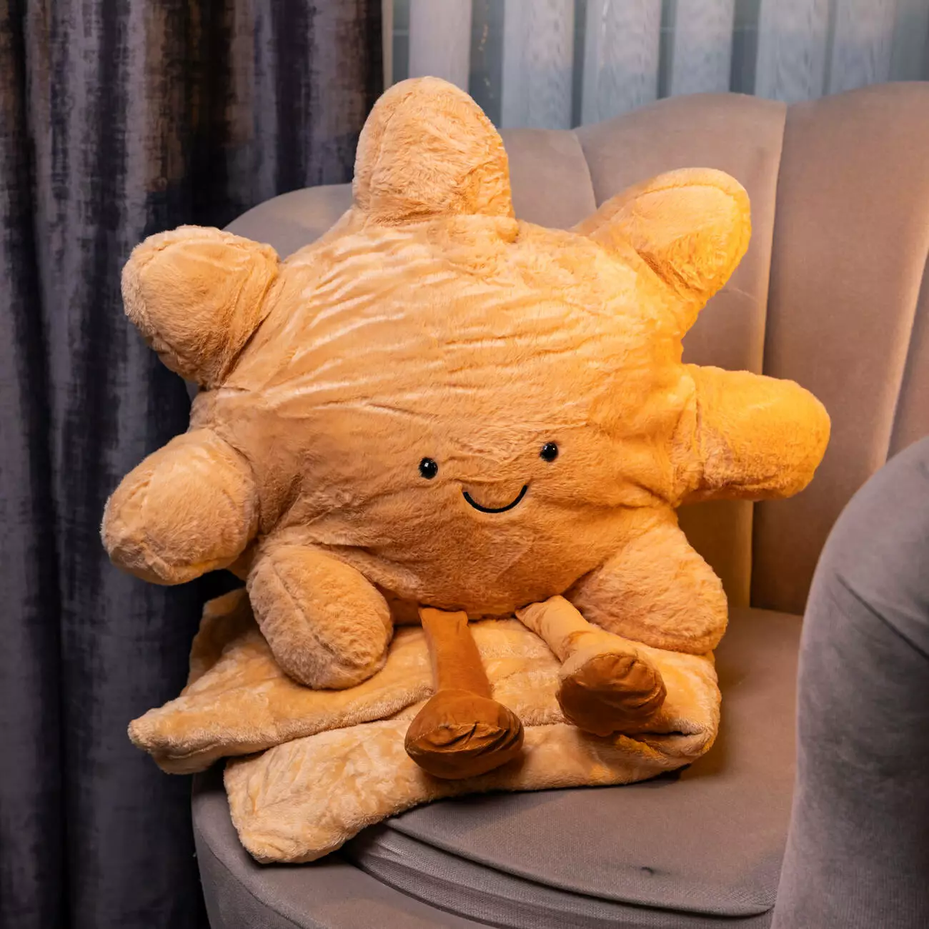 Завдяки простій формі та універсальному дизайну, подушка-іграшка «Сонечко» з пледом підходить для дітей і дорослих. Вона не потребує складного догляду, легко поєднується з різними стилями інтер’єру та може розглядатися як корисний подарунок для дому.