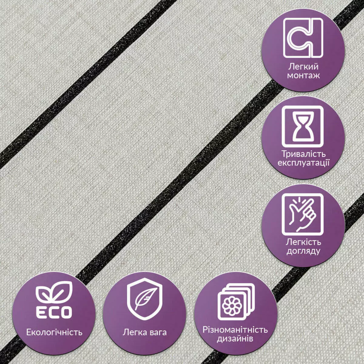 • Легка установка: Завдяки клейовому шару монтаж вінілових рейок швидкий і простий, без потреби в додаткових матеріалах. Рейки легко ріжуться монтажним ножем або ножицями, укладаються стик у стик. Відсоток обрізу для настінних покриттів дуже низький.