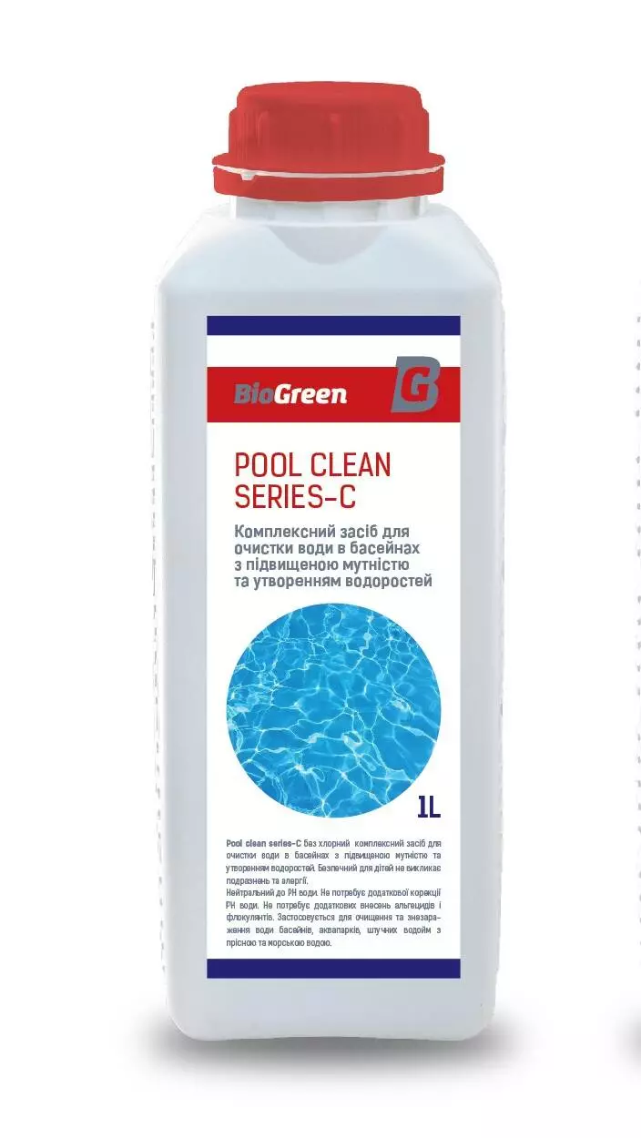 Pool clean series-C без хлорний універсальний рідкий засіб для комплексної обробки води в плавальних басейнах з підвищеною мутністю та утворенням водоростей. Безпечний для дітей не викликає подразнень та алергії. Нейтральний до РН. Безпечний для людей та тварин. Не має подразливої дії на органи дихання. Не подразнює слизову оболонку та шкіру. Не утворює у воді та повітрі токсичні сполуки. Не викликає корозії металів та руйнування інших поверхень. Безпечний при обслуговуванні басейнів.