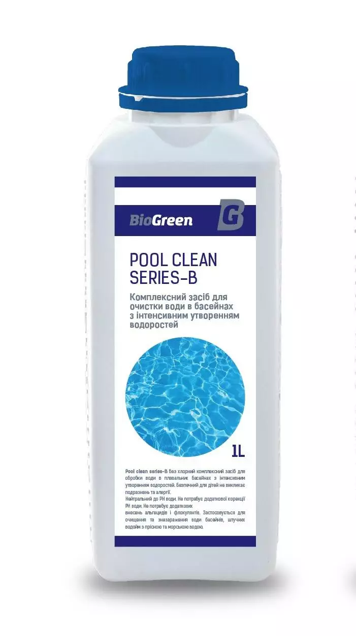 Pool clean series-В, без хлорний універсальний рідкий засіб  для комплексної обробки води в плавальних басейнах з інтенсивним утворенням водоростей. Безпечний для дітей не викликає подразнень та алергії. Нейтральний до РН. Безпечний для людей та тварин. Не має подразливої дії на органи дихання. Не подразнює слизову оболонку та шкіру. Не утворює у воді та повітрі токсичні сполуки. Не викликає корозії металів та руйнування інших поверхень. Безпечний при обслуговуванні басейнів.