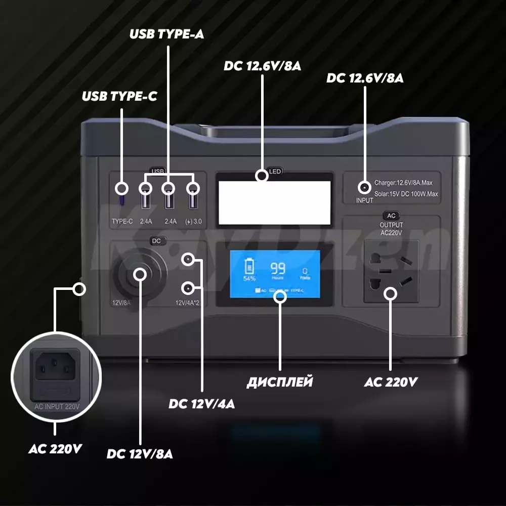 DC-разъем; USB Type C; Гнездо прикуривателя; 3 x USB Type A; USB Type A; 1 x USB Type C; Розетка 220 В