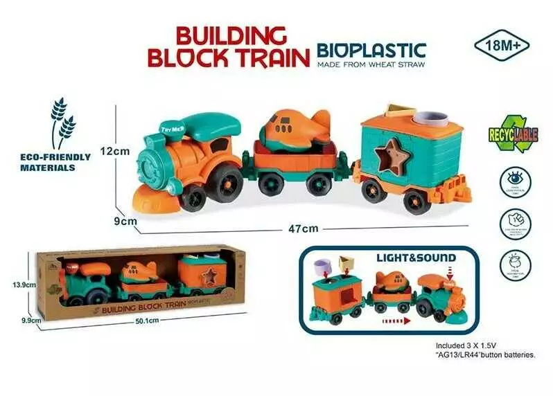 Потяг 933-832 AM (40/2) локомотив, 2 вагони, звуки, підсвічування, геометричний сортер, біопластик, в коробці