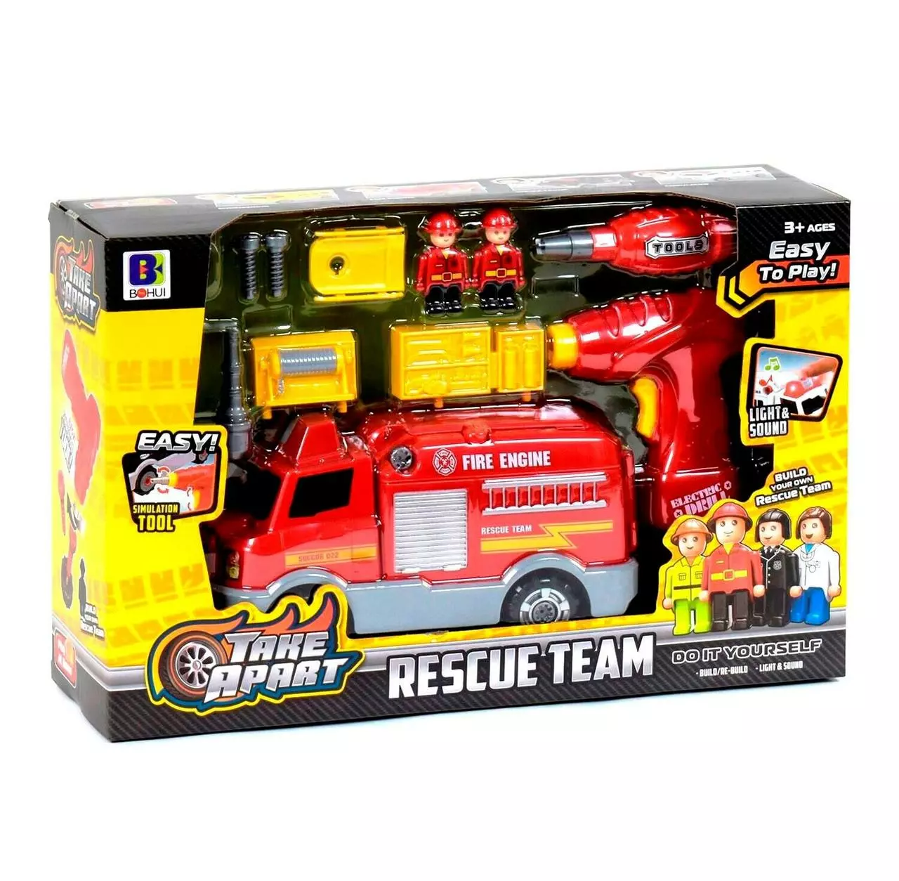 задние двери; звуковые и световые эффекты; Пожарная машина обладает