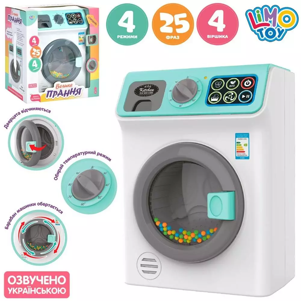Фотография 1 товарной позиции интернет-магазина детских игрушек www.smarttoys.com.ua Пральна машина M 4608 I UA оберт. барабан, муз.-укр, світло, бат., кор., 23-25-15 см