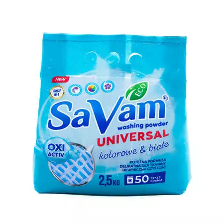 Пральний порошок SaVam Universal 2,5 кг-універсальний засіб для ефективного прання для кольорових та білих речей.Забезпечує глибоке очищення волокон,видаляє стійкі забруднення та зберігає яскравість кольорів.