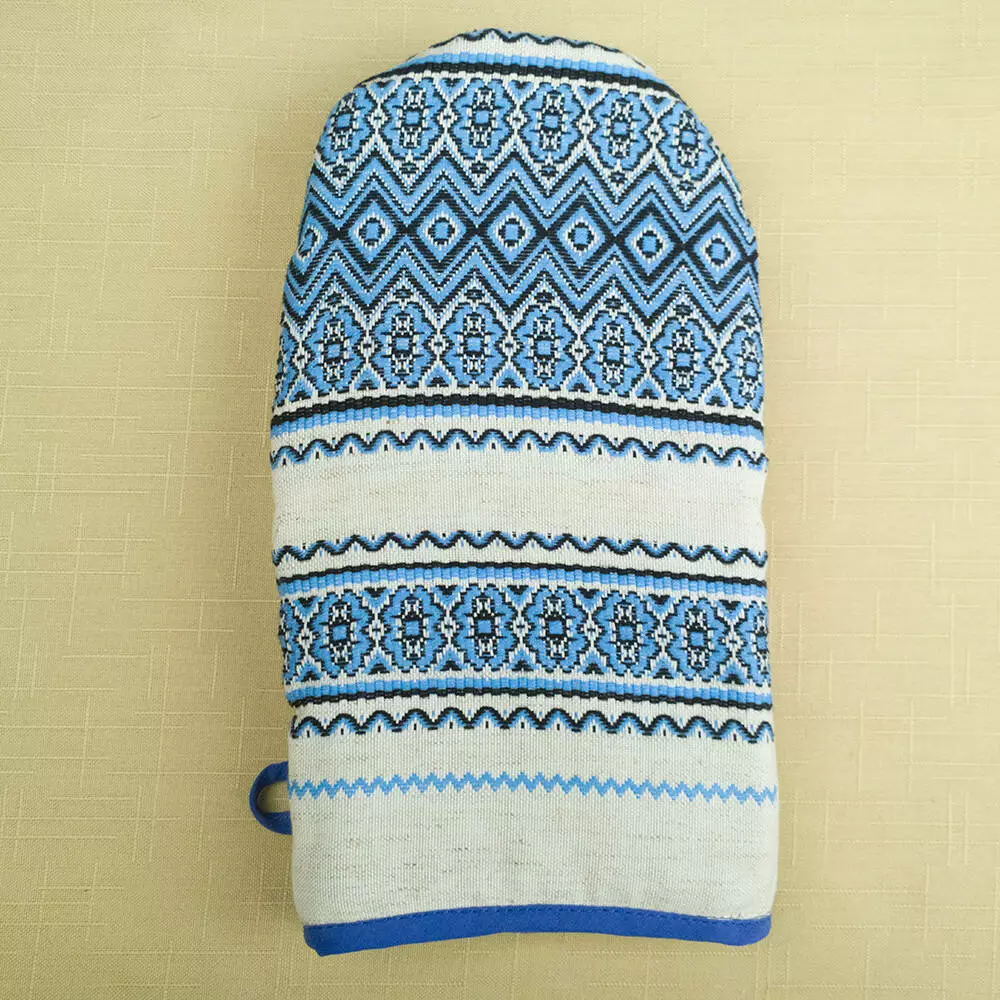 Льняная прихватка-варежка для кухни непременно станет верным помощником хозяйки! Достаточно плотная ткань и мягкий наполнитель позволяют прихватке долго служить Вам и оберегать Ваши ладони от перегревания во время готовки. Этнический орнамент добавит в интерьер народных нот. Всегда на своем месте этот кухонный аксессуар будет благодаря петельке.