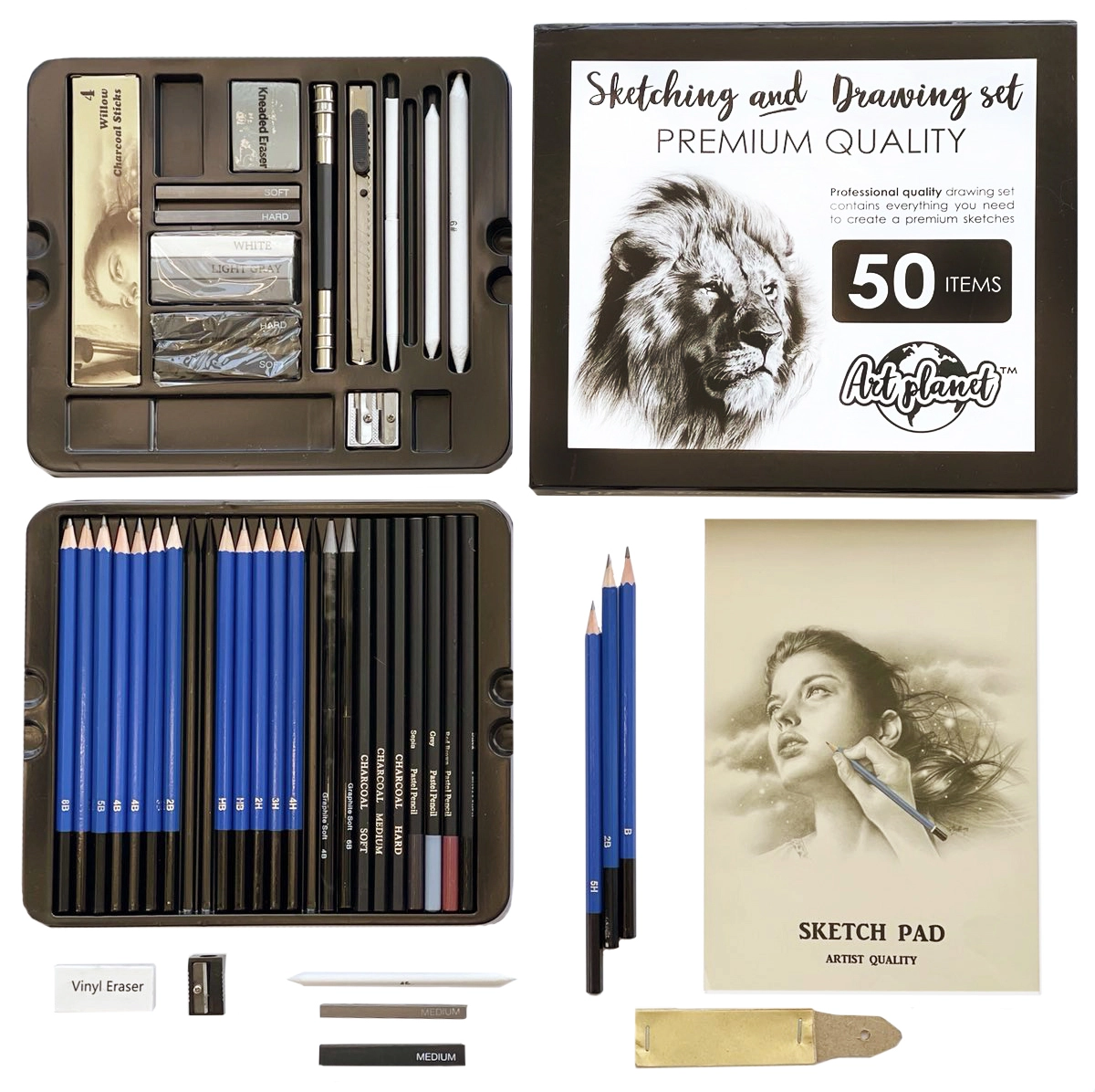 У професійному наборі для художника містить 50 предметів, включаючи паперову краї, пастельні, вугільні і графітові олівці, ластики, скріпки та інші предмети.