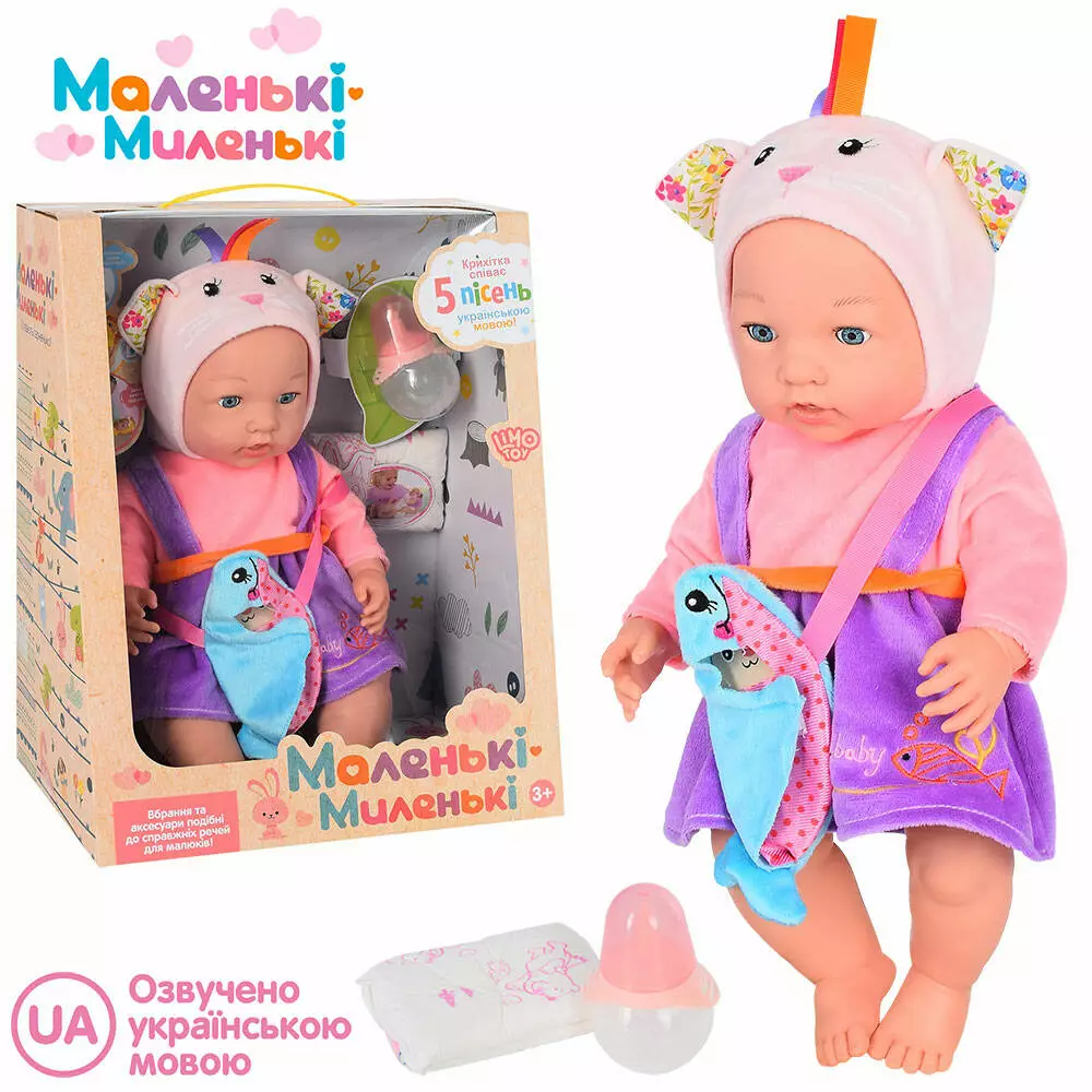 Фотография 1 товарной позиции интернет-магазина детских игрушек www.smarttoys.com.ua Пупс M 4723 I UA п'є-пісяє, пляшечка, підгузник, 5 пісень, муз. (укр.), бат.-таб., кор., 30-38-21см.