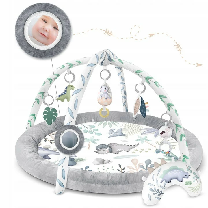 Поэтому мы добавили к коврику многофункциональные игрушки, которые можно повесить на дуги - пусть что-то стучит, звенит и шуршит! Среди игрушек есть даже пищащая игрушка - динозавр и ископаемое!