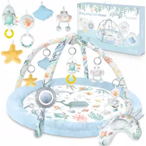 Именно поэтому мы добавили к коврику многофункциональные игрушки, которые можно повесить на дуги - пусть что-то стучит, звенит и шуршит! Среди игрушек есть даже пищащий краб!