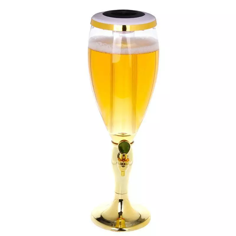 Пропонуємо до вашої уваги унікальний пивний девайс - диспенсер для пива з охолодженням. Дана модель виконана з якісного прозорого пластику у вигляді гарного кубка із золотистою основою. Внизу резервуару встановлений зручний краник. Місткість для пива з краном дозволяє регулювати наповнення пивного келиха за власним бажанням. Модель компактна (всього 15 см у діаметрі) і вона буде зручною і для невеликої компанії, і для індивідуального використання.